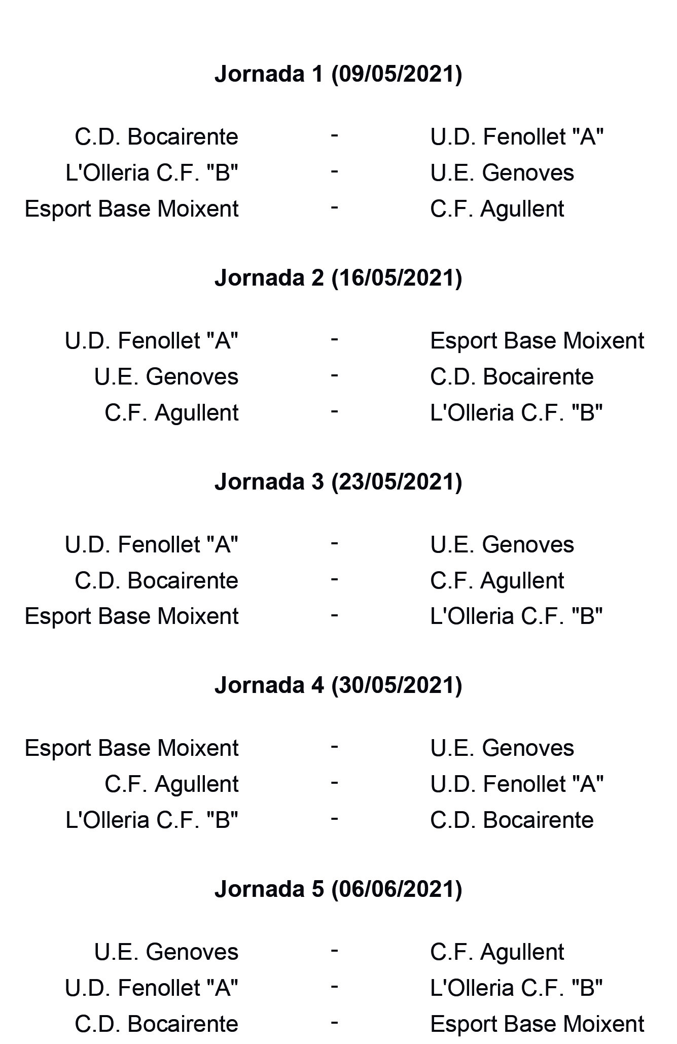 Peñ que fa a la part baixa del quadre on es troben el Bocairent, L'Olleria B i l'Agullent, tots ells també començaran el cap de setmana del 8 i 9 de maig. Els bocairentins rebran a casa al Fenollet, els filial vidrier rebrà a la Solana al Genovés i per últim, l'Agullant del recentment fitxat Nacho Dorado es desplaçarà fins a Moixent per enfrontar-se a l'Esport Base.