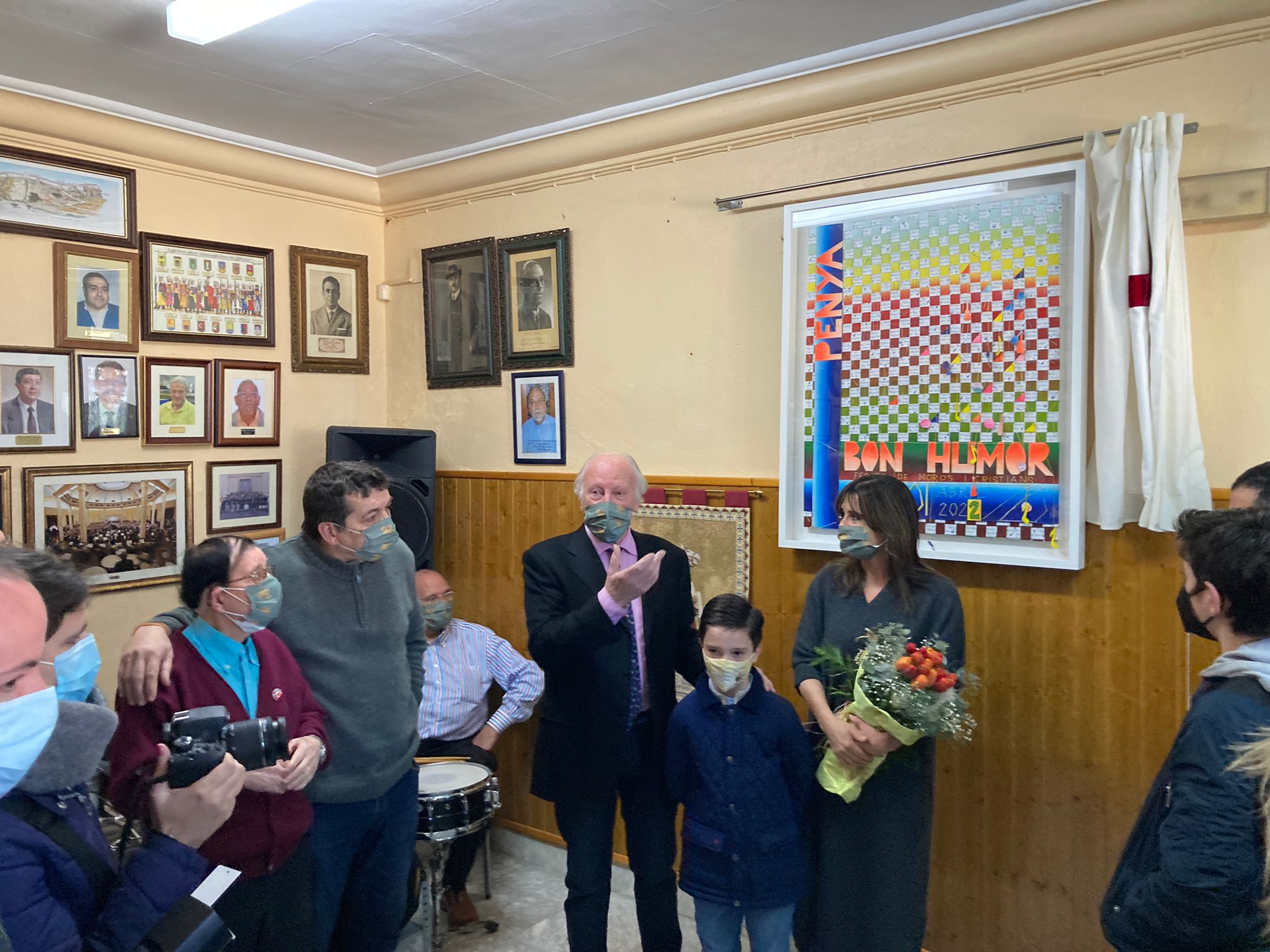 Amb un gran somriure, minimascletada, música en semi-directe i molt bon humor, la Penya més autèntica del món festejava que venen les Festes. Després de dos anys de patiment, els fidels socis d'aquesta arrelada entitat alcoiana, descobria el segon cartell de Festes més important. En aquesta ocasió, l'obra és de Mónica Jover. Una espècie de tapís, una innovadora composició dedicada a la Penya i de la que pengen lletres cosides amb fils de colors. Molt original, molt de Jover, qui no podia amagar la seua satisfacció en rebre la calorosa acollida dels membres de l'entitat i dels múltiples convidats.