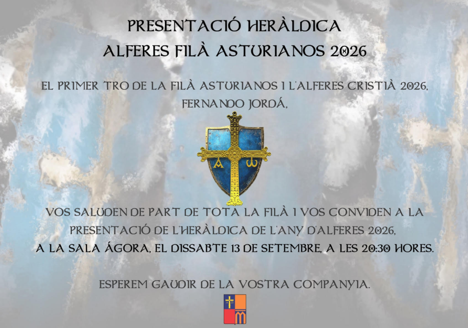 Com a primer acte de les celebracions de l’Any d’Alferes Cristià 2026, la Filà Asturianos presentarà l’Heràldica de l’Alferes Cristià 2026 el pròxim 13 de setembre a les 20:30 h a la sala Àgora.