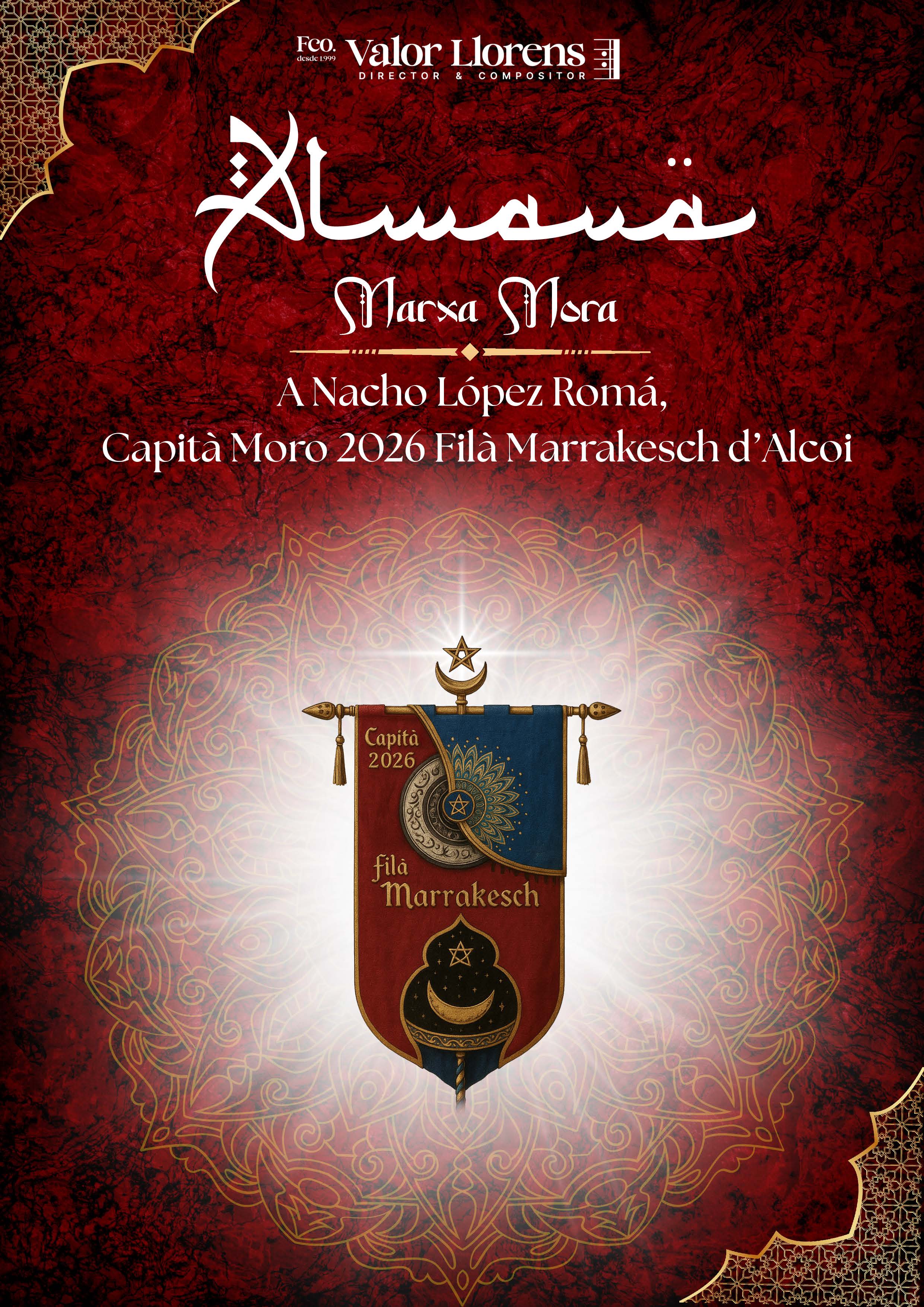 En el concert “Marrakesch en Sons”, els assistents podran escoltar la versió de piano de la marxa Almanä, de Francisco Valor Llorens, dedicada al Capità 2026, José Ignacio López Romá, un nexe entre dues èpoques: la primera marxa documentada de 1905 i el futur que culminarà en les Festes de 2026. L’estrena oficial de la marxa tindrà lloc posteriorment el Diumenge de Rams, 29 de març de 2026, a càrrec de la Societat Musical Nova d’Alcoi.