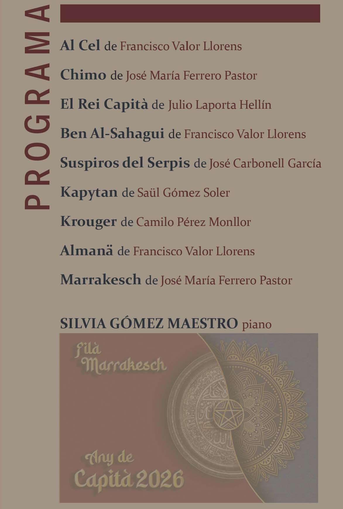 L’Any 2026 se celebra la capitania de la Filà Marrakesch i amb motiu d’aquesta, la filà ha organitzat un concert de piano a càrrec de la pianista Silvia Gómez Maestro. L'acte té lloc aquest 21 de març a les 19h a l’IVAM CADA d’Alcoi.