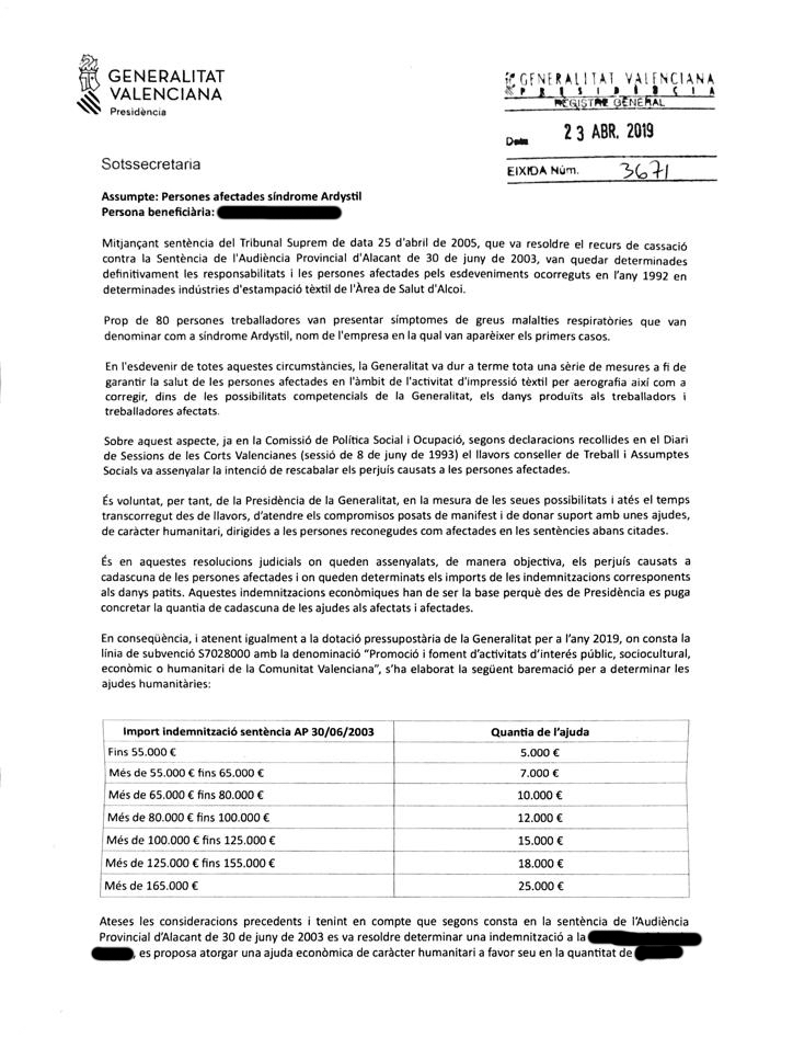 Aquests dies, les persones afectades del cas Ardystil -o les seues famílies- han rebut una correspondència molt important. Com a remitent, Presidència de la Generalitat Valenciana, i en el seu interior, un detall de la indemnització que rebran per part de l'ens autonòmic. D'aquesta forma, s'inicia un procés de reparació històrica que s'ha allargat més de 25 anys.