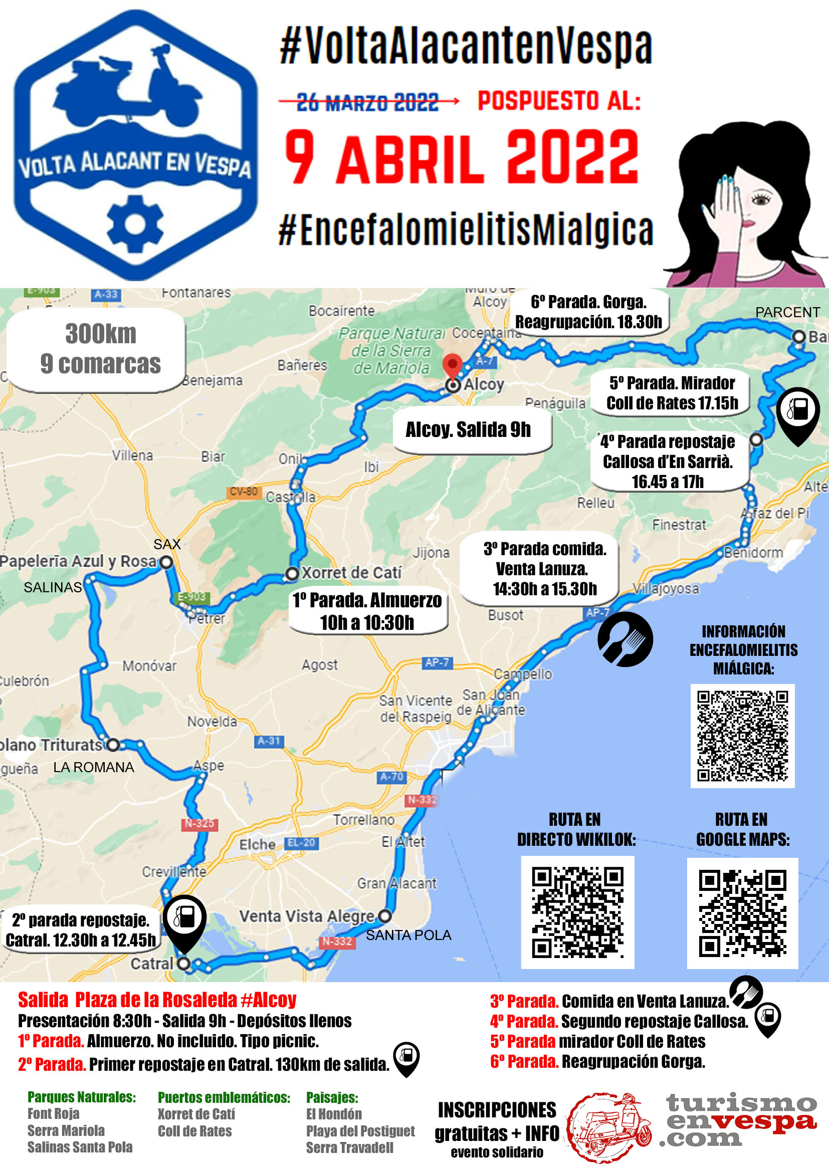 El pròxim dissabte 9 d’abril des d’Alcoi eixiran 50 vespes que recorreran 300km a lo llarg de les 9 comarques de la província d’Alacant. S’han apuntat de diferents punts d’Espanya i eixiran a les 9h i tornaran a les 19h.