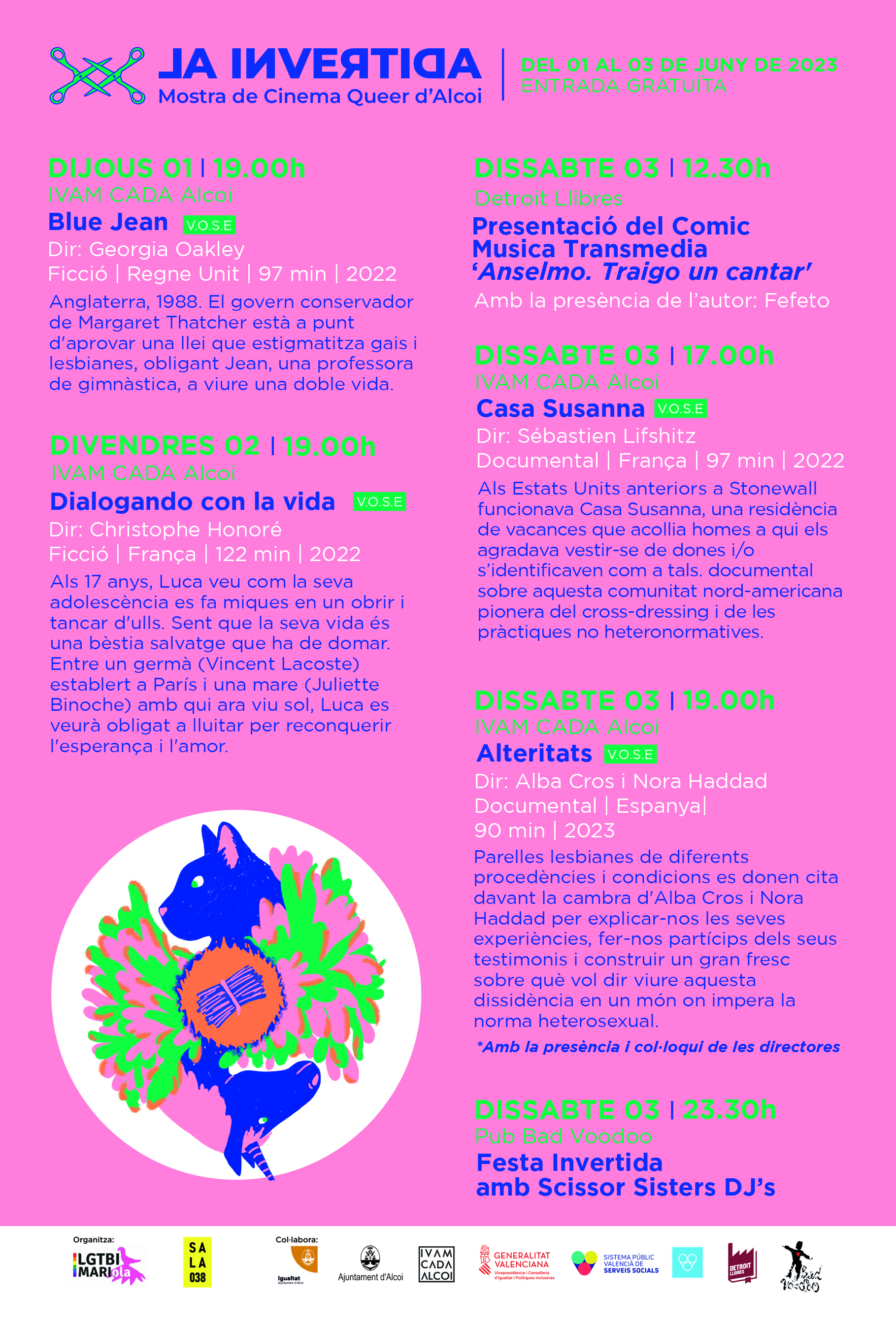 Les projeccions, en versió original subtitulada, de les pel·lícules (dues de ficció i dues de caràcter documental) s’han programat al llarg dels dies 1, 2 i 3 de juny al Saló d’Actes de l’IVAM CADA, a les quals es podrà accedir de forma completament gratuïta. D’altra banda, el còmic “Anselmo, Traigo un cantar” de Fefeto, es presentarà a la Llibreria Detroit i “La Festa Invertida” tindrà lloc al Pub Bad Voodoo amb la presència de Scissor Sister DJ’s.