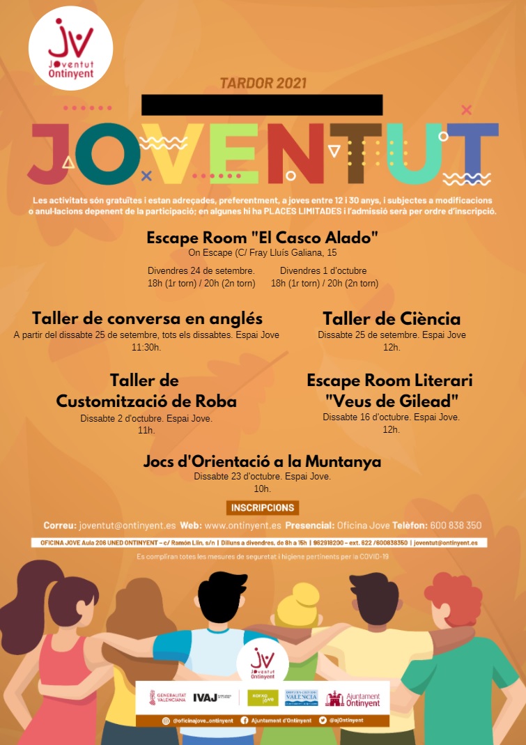 La Regidoria de Joventut de l’Ajuntament d’Ontinyent ha programat per als mesos de setembre i octubre sis activitats lúdiques i formatives per al jovent de la ciutat. Totes les activitats són d'entrada gratuïta i estan dirigides als joves d'entre 12 i 30 anys.