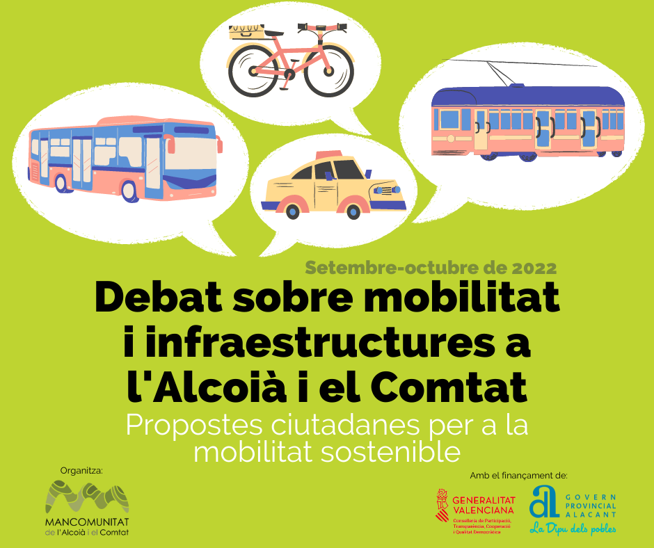 La Mancomunitat de l’Alcoià i El Comtat ha organitzat un procés obert i participatiu per tal de conèixer de prop les necessitats de la ciutadania en matèria de transport, així com per a dissenyar de forma col·laborativa possibles solucions als reptes als quals s’enfronta actualment el territori.