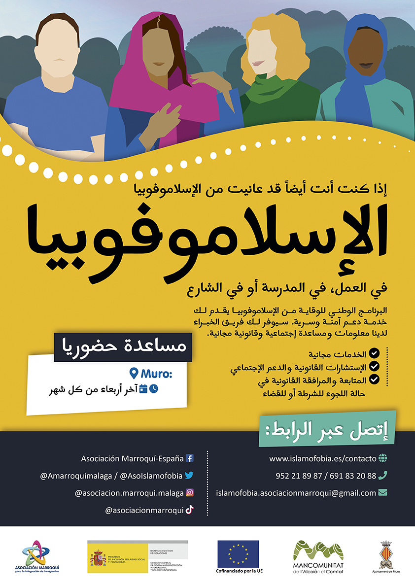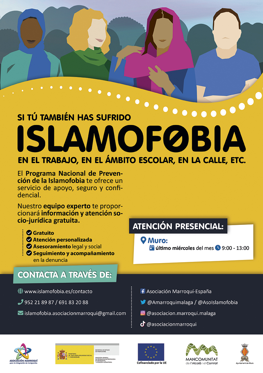 A més, Muro serà el lloc d’acollida de les persones que pateixen esta discriminació. S’oferirà assessorament presencial a les persones que patisquen discriminació l’últim dimecres de cada mes per tal de servir de suport per a la integració i la convivència. Aquestes actuacions, impulsades per l’Associació Marroquí per a la Integració d’Immigrants formen part del Programa Nacional de Prevenció d’Islamofòbia i es duran a terme per primera vegada en la Comunitat Valenciana.