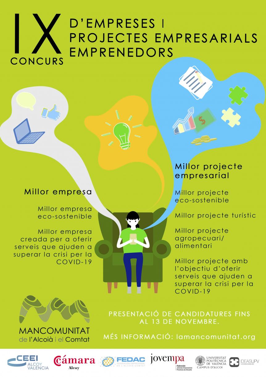 Fins al 13 de novembres es poden presentar candidatures al IX Concurs d’Empreses i Projectes Empresarials Emprenedors que organitza la Mancomunitat de L'Alcoià i El Comtat. La principal novetat del 2020 és que hi haurà premis per a aquells que hagen creat projectes o empreses que ajuden a superar la crisi provocada per la Covid-19. S'atorgaran 6.000 euros en premis.