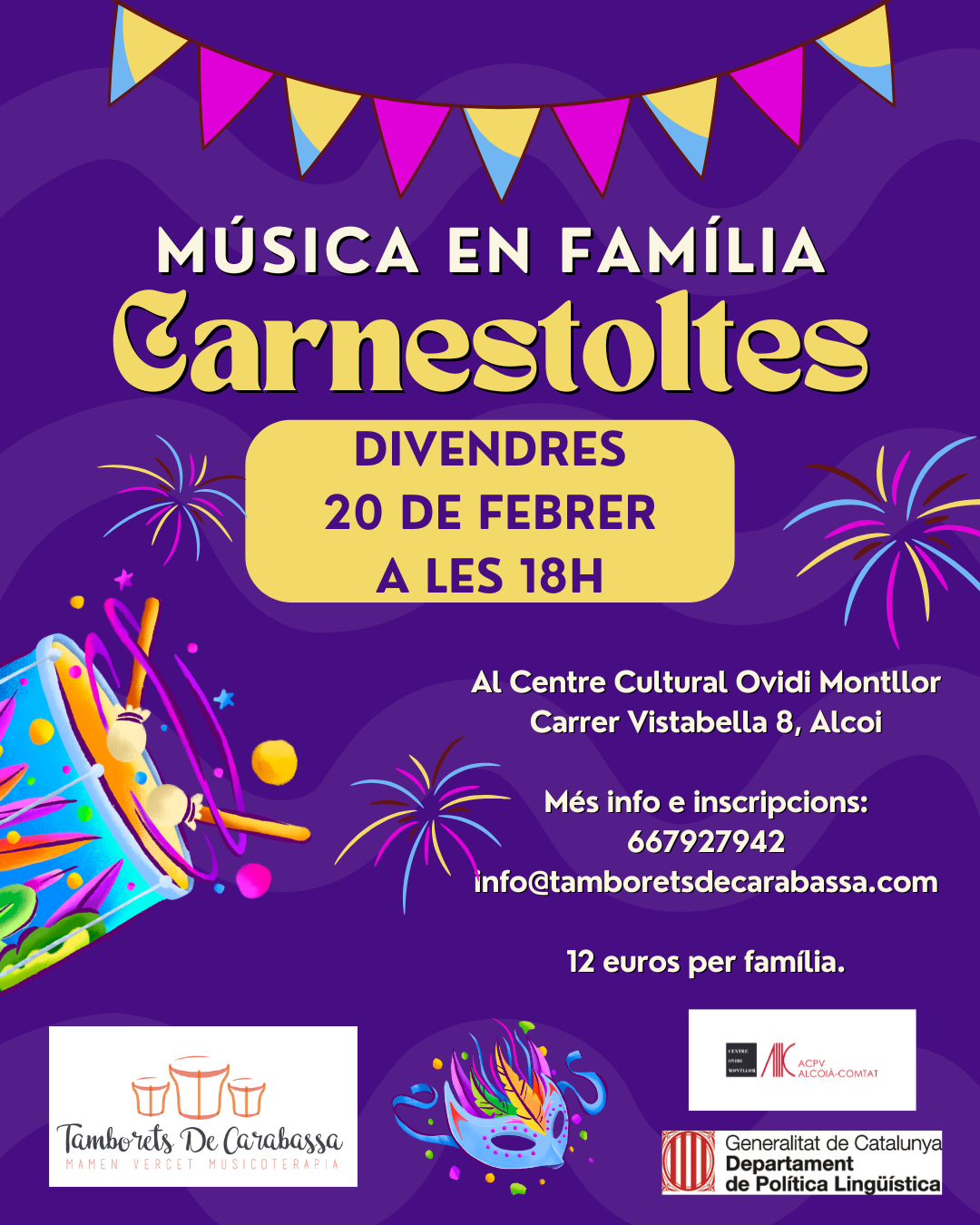El Centre Ovidi Montllor ha organitzat una nova sessió del taller ‘Música en família’ que imparteix la musicoterapeuta i Treballadora Social Mamen Vercet, creadora de ‘Tamborets de Carabassa’. Es tracta del primer taller de l’any i tindrà lloc aquest divendres 20 de febrer a les 18h sota la temàtica de ‘Carnestoltes’.