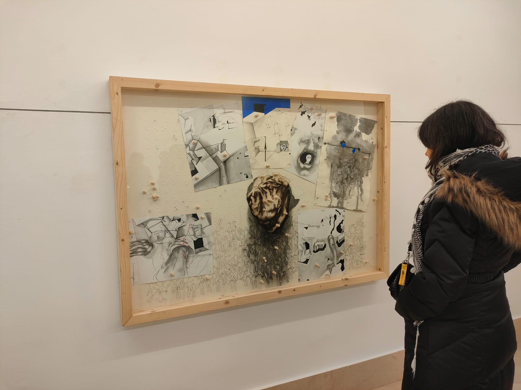 L’exposició en el COM compta amb un quadre fora del tema central, tot i que també està lligat al braille. Però es tracta d’una obra reivindicativa amb la qual es condemna el genocidi a Palestina. Rafael Hernández el va fer per a l’exposició a París del 2025 per la Pau, i ara el porta fins a Alcoi. El quadre va acompanyat d’un text que conclou dient ‘Quantes vegades caldrà crucificar a Jesús perquè el poble hebreu (jueus, cristians i musulmans) puga viure en pau amb si mateixa?’.