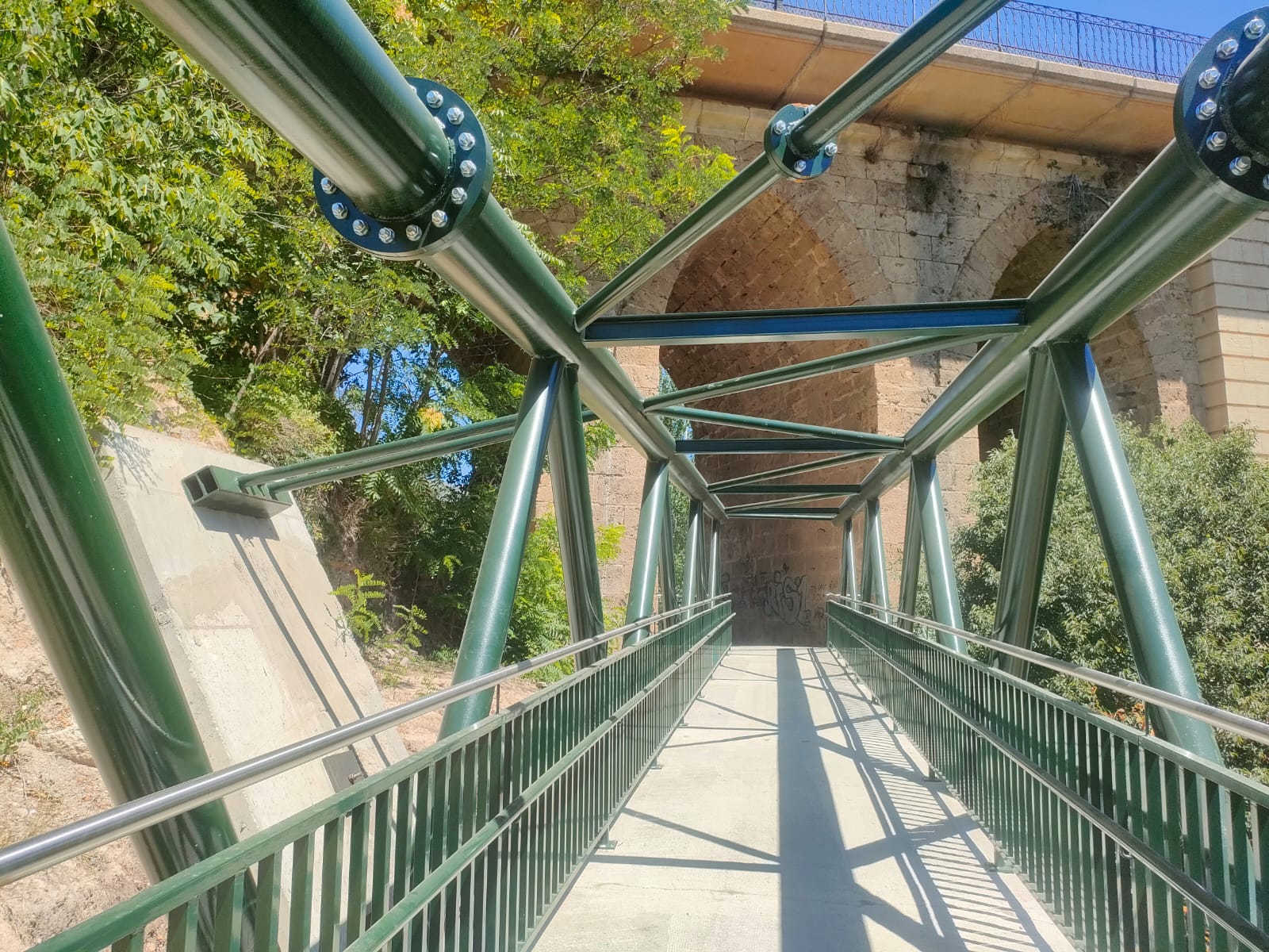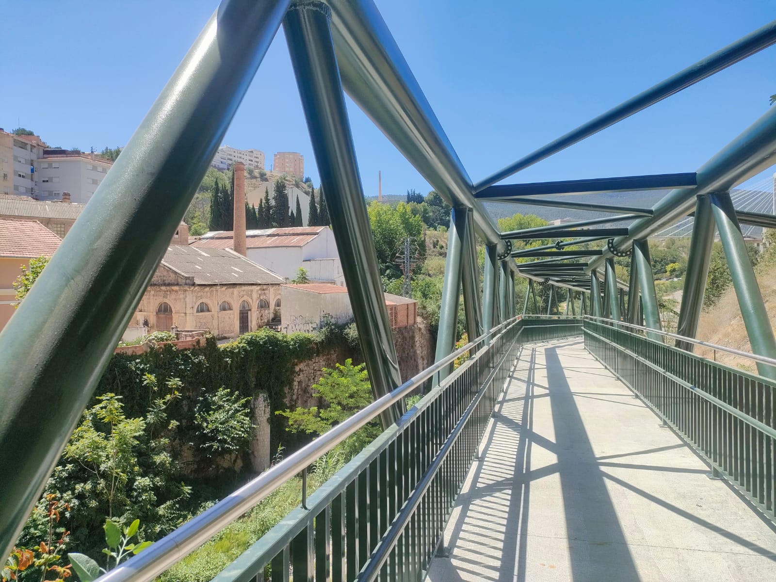 I ara es pot, per fi, fer ús d’aquesta. La passarel·la connecta els dos trams per als vianants a banda i banda del pont de Maria Cristina, al costat del parc de Cervantes a Alcoi.