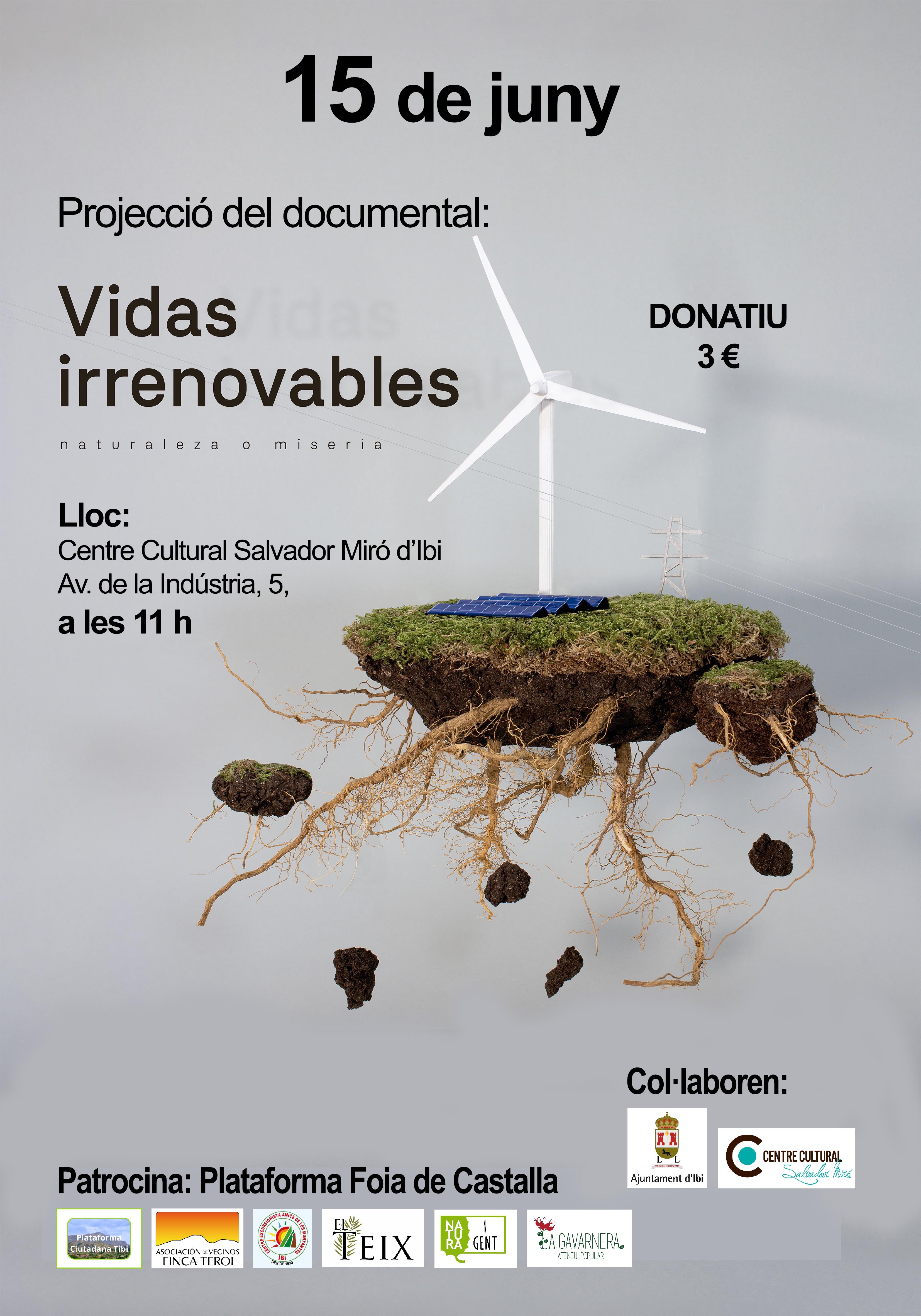 La multitud d’anuncis de projecció de col·locació de macroplantes fotovoltaiques a les comarques ha motivat que la Plataforma Foia de Castalla organitze la projecció del documental ‘Vidas irrenovables’. L’objectiu és sensibilitzar a la població del que ja ha ocorregut a altres llocs del territori nacional: L’energia renovable està paradoxament destruint ecosistemes, economies i societats del món rural.