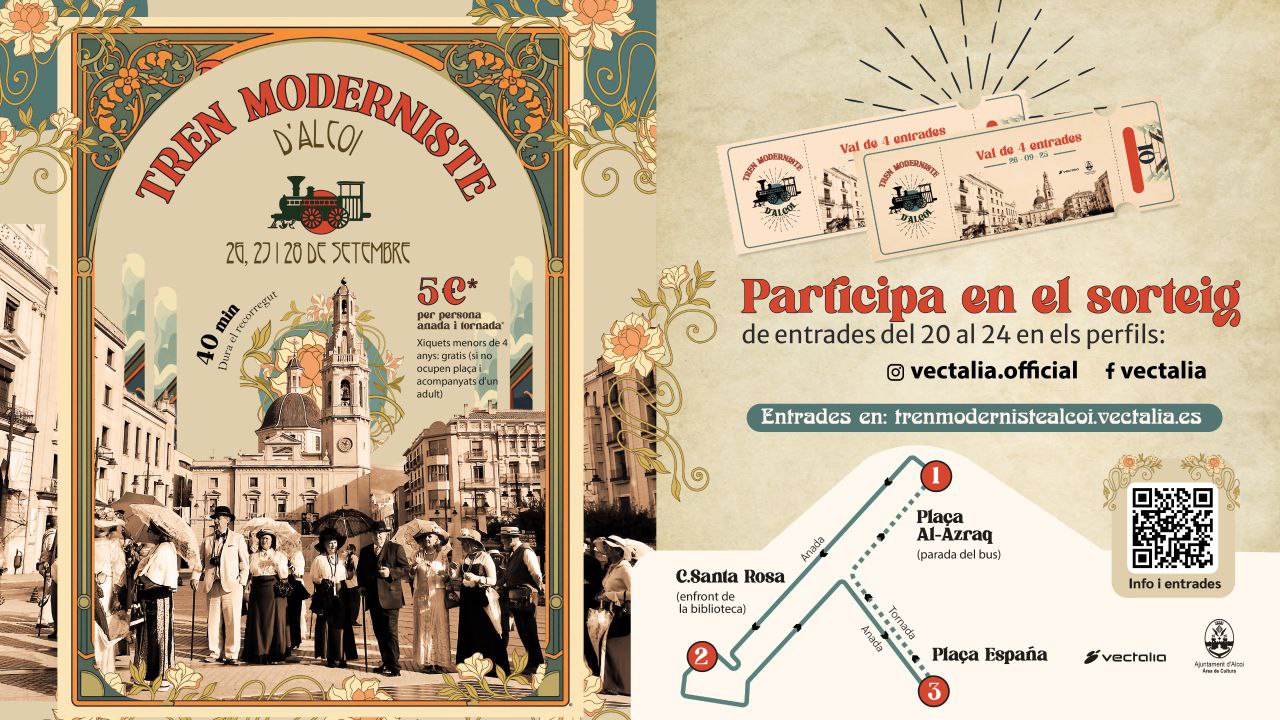 D'ací poc Alcoi s'endinsa en el modernisme per a celebrar una de les èpoques de major esplendor i, com cada any, tindrem moltes cites i activitats i, també, novetats. Una d'elles és el trenet turístic que funcionarà durant el cap de setmana del 26 al 28 de setembre. En este tren els turistes podran pegar una volta per la ciutat, però també és una opció per al veïnat de la Zona Nord i Santa Rosa que vulguen anar a la Fira Modernista del centre.