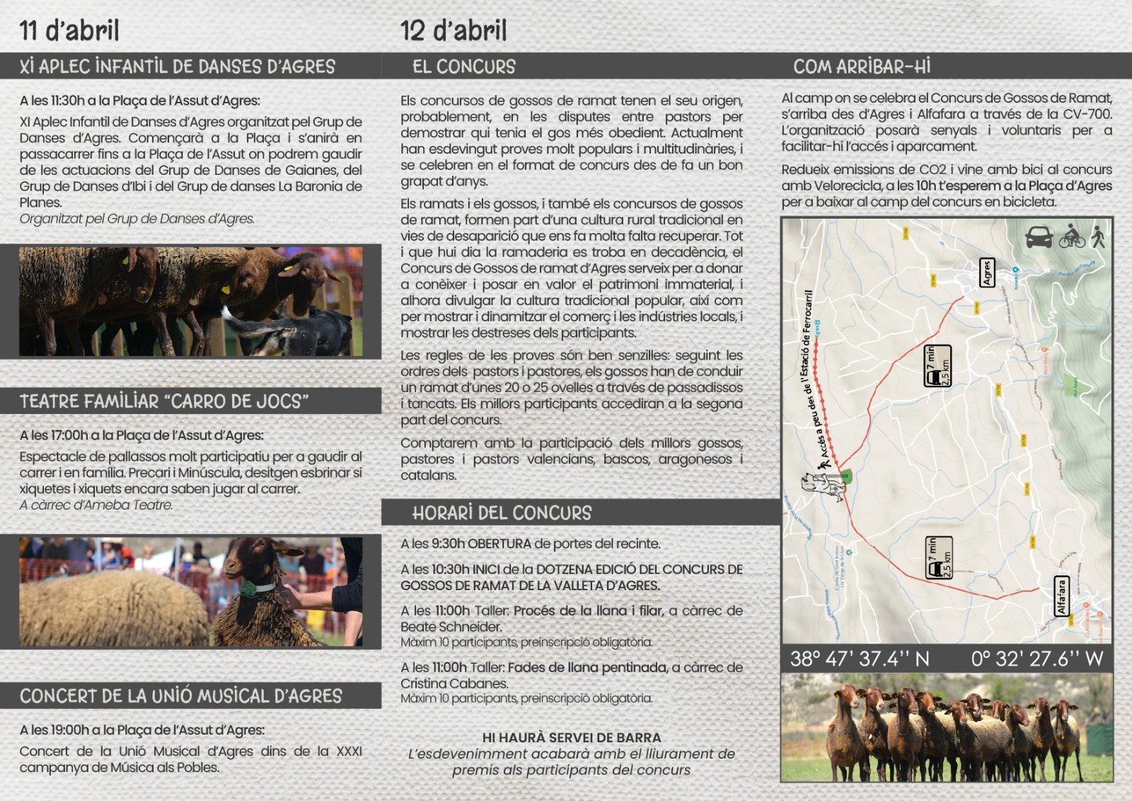 Agres tornarà a acollir la celebració de la XII edició del Concurs de Gossos de Ramat, que tindrà lloc el cap de setmana de l’11 i 12 d’abril. Organitzat pel Col·lectiu l’Esquella amb el suport d’entitats locals, el concurs pretén destacar la importància del pasturatge extensiu com a eina de conservació del paisatge, prevenció d’incendis i protecció de la biodiversitat.