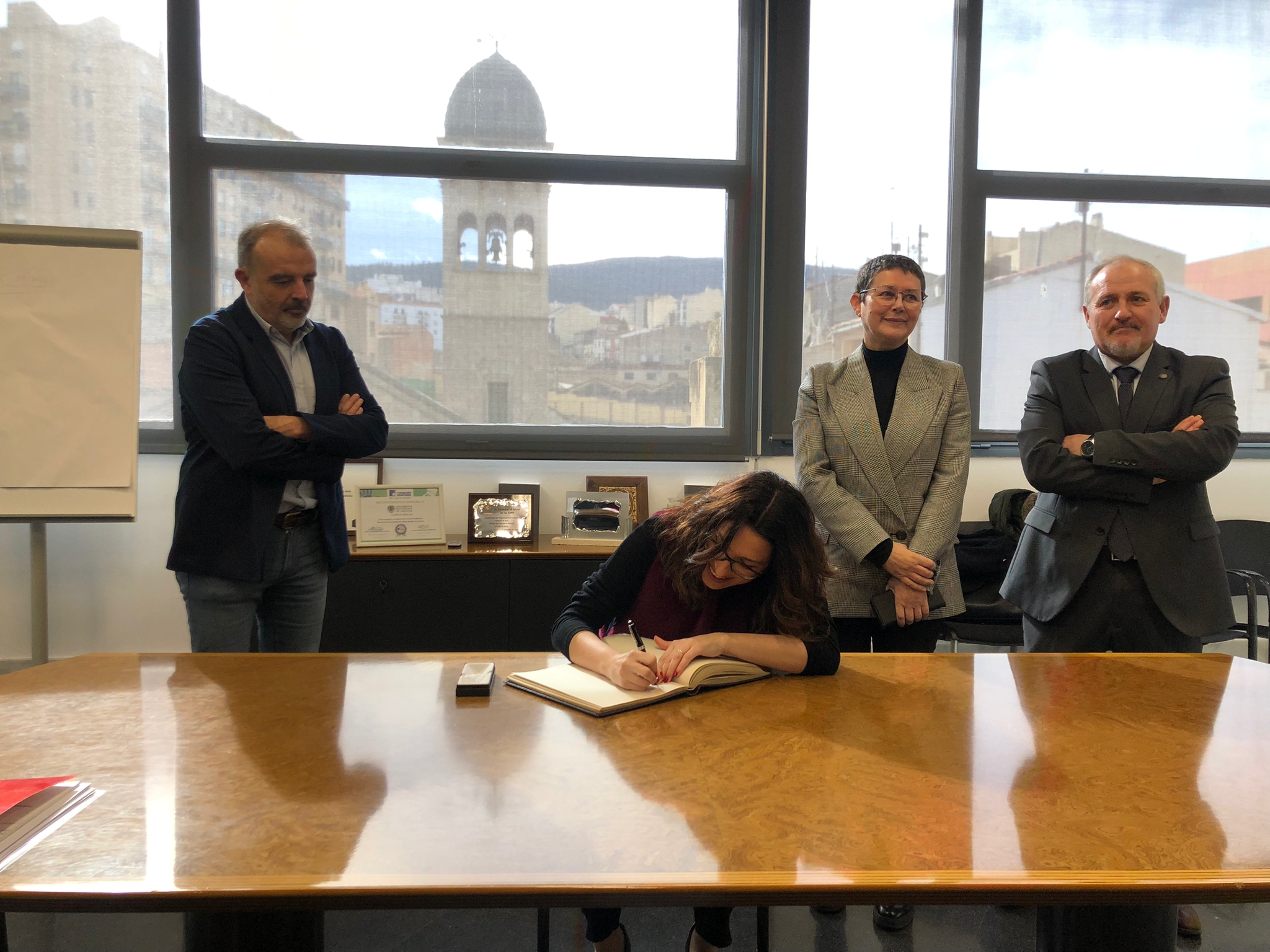 També han estat present Pau Bernabéu, director del campus d’Alcoi, qui li ha fet entrega d’un dossier de totes les actes que hi ha de Cegarra i l’ha convidada a signar al llibre d’or de la institució, a més d’acompanyar-la en la visita. A més, Jordi Martínez, vicealcalde de la ciutat, ha agraït aquesta visita a la ciutat i ha destacat qeu cada dia al campus treballen i estudien 2500 homes i dones que son un important motor per a Alcoi i ha convidat a la viceconsellera a visitar la ciutat sempre que vulga i a conèixer tots els reptes, les preocupacions i necessitats de la localitat.