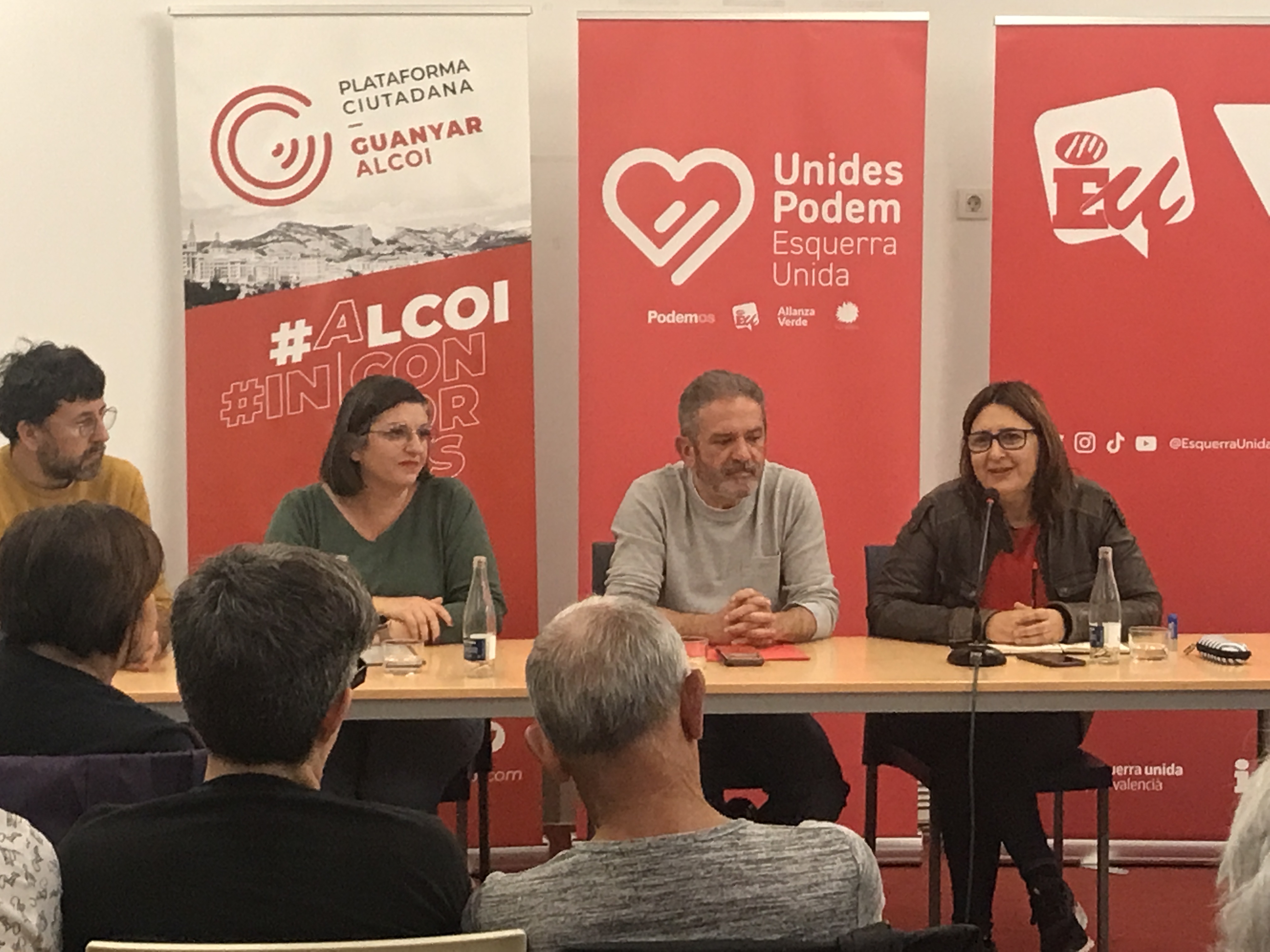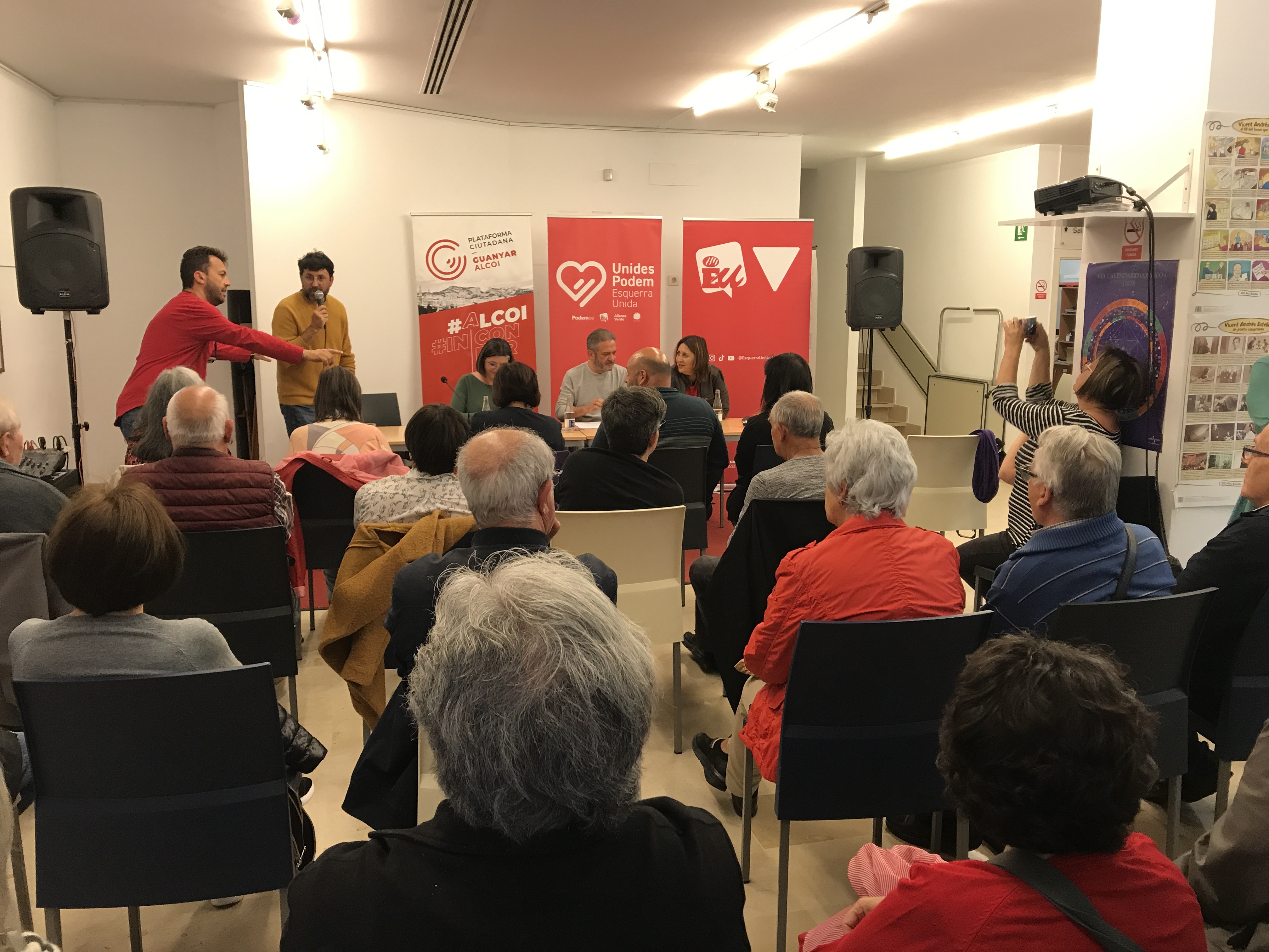 A diferència dels actes multitudinaris del PP i el PSOE, Guanyar Alcoi ha convocat aquest acte de campanya al Centre Ovidi Montllor que, per la seua capacitat física, no pot donar cabuda a centenars i centenars d’assistents. Així i tot, dins de les possibilitats de l’espai, el míting ha aconseguit reunir a unes 40 persones que, això sí, no han deixat d’aplaudir les intervencions dels tres ponents.
