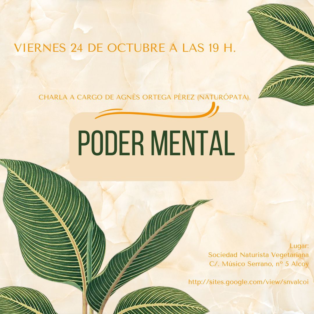 El divendres 24 d’octubre, a les 19:00 hores, la Societat Naturista Vegetariana d’Alcoi (C/Músic Serrano, 8) obri les portes per a acollir la xarrada gratuïta “El poder mental”, a càrrec d'Agnès Ortega, actriu, directora i terapeuta holística alcoiana. La trobada forma part de la programació mensual de l’entitat i està pensada per a totes les persones interessades en el creixement personal i la salut integral.