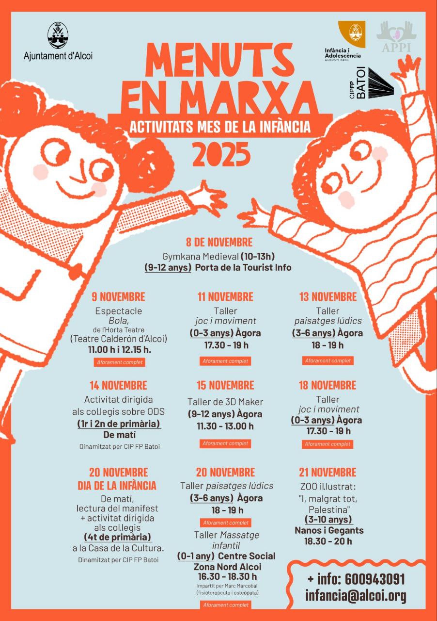 El pròxim 20 de novembre se celebra el Dia de la Infància, i des de l'Ajuntament d'Alcoi han preparat un seguit d'activitats durant tot el mes. Però al poc de fer-les públiques s'omplin i a hores d'ara queden places en la meitat d'elles. En el següent cartell podeu consultar a les que encara podeu anar, i també teniu el telèfon i correu on reservar plaça. Tenim activitats molt divertides com una Gimcana per a xiquets entre 9 i 12 anys; un taller de massatge infantil per a nadons acabats de nàixer; o l'activitat del 21 de novembre per a xiquets de 3 a 10 anys amb la presència de membres del grup ZOO.