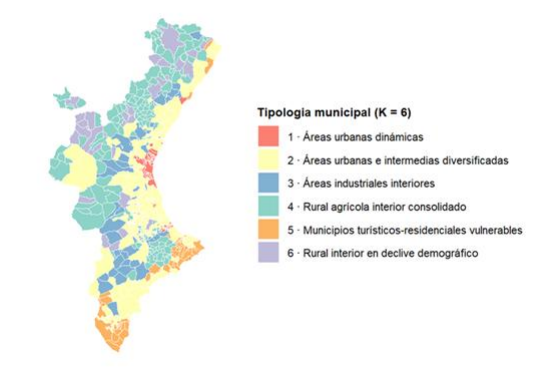 La Conselleria d’Economia, Hisenda i Administració Pública ha publicat l’estudi Tipología municipal de la Comunitat Valenciana, elaborat en el marc de col·laboració amb la Universitat de València, que classifica els 542 municipis valencians segons indicadors demogràfics, socioeconòmics i d’accessibilitat. L’anàlisi identifica sis grans tipologies i permet detectar quins territoris presenten majors riscos de desavantatge estructural.