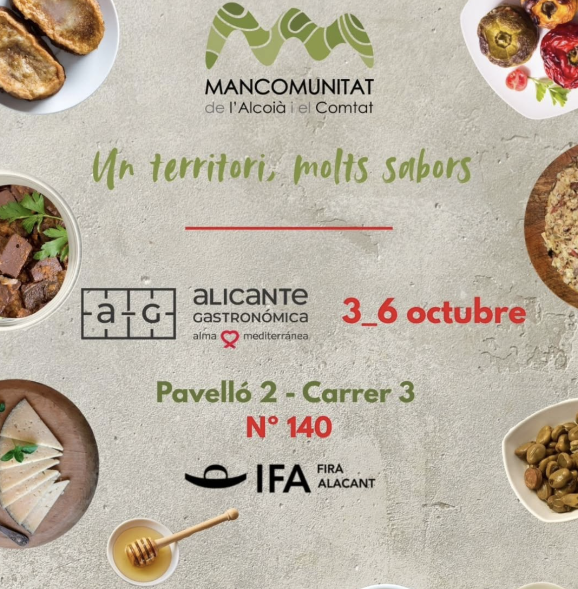 Del 3 al 6 d'octubre, la Mancomunitat de l'Alcoià i el Comtat estarà present en Alicante Gastronómica, una cita ineludible per a aquelles persones que volen conéixer de prop (i, sobretot, tastar) els menjars més típics de la Comunitat Valenciana.