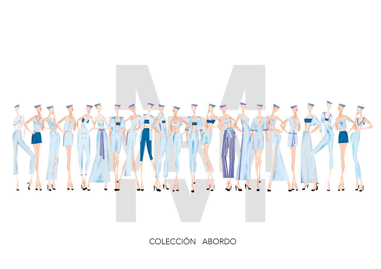 La col·lecció Abordo consta de 22 dissenys de primavera-estiu, d'estil navy inspirada en els mariners, "amb els uniformes blancs, les mítiques ratlles blaus i blanques, destacant en diversos dissenys els botons daurats amb l'àncora". Són peces còmodes i lleugeres, amb tocs blaus amb teixit denim, i amb tocs comuns com els barrets matiners. I la col·lecció es presenta en un lloc emblemàtic com el port Marina de Salinas, "encaixant els dissenys amb els vaixells, veles, i rodejats de la brisa del mar Mediterrani".