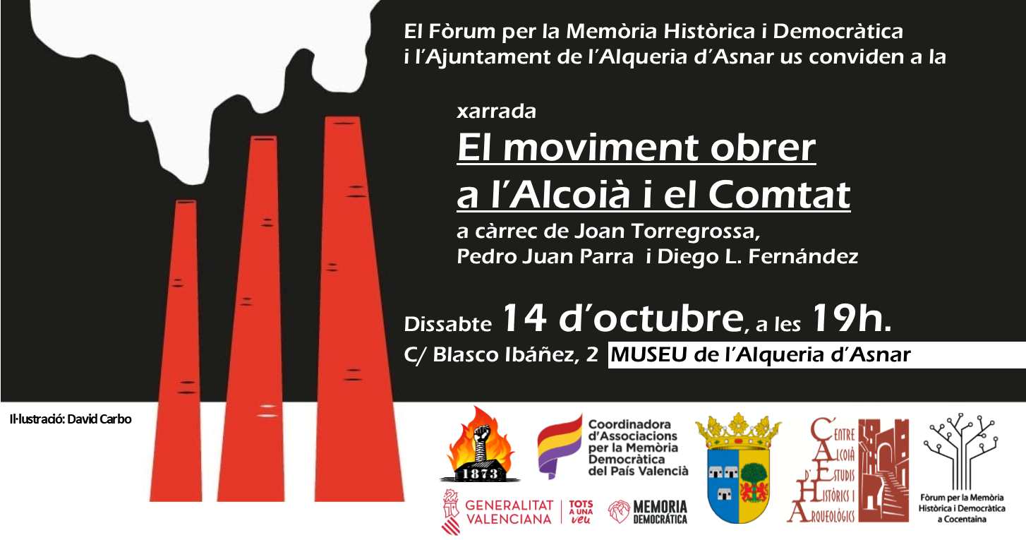 El pròxim 14 d’octubre a les 19h el Museu de l’Alqueria d’Asnar (C/ Vicente Blasco Ibáñez, 2) acull la xarrada sobre la història del moviment obrer a l’Alcoià i el Comtat organitzada des del Fòrum per la Memòria Històrica i Democràtica. L’acte estarà presentat per Joan Torregrossa, vicesecretari de l’associació, parlaran Diego L. Fernández i Pedro Juan Parra.
