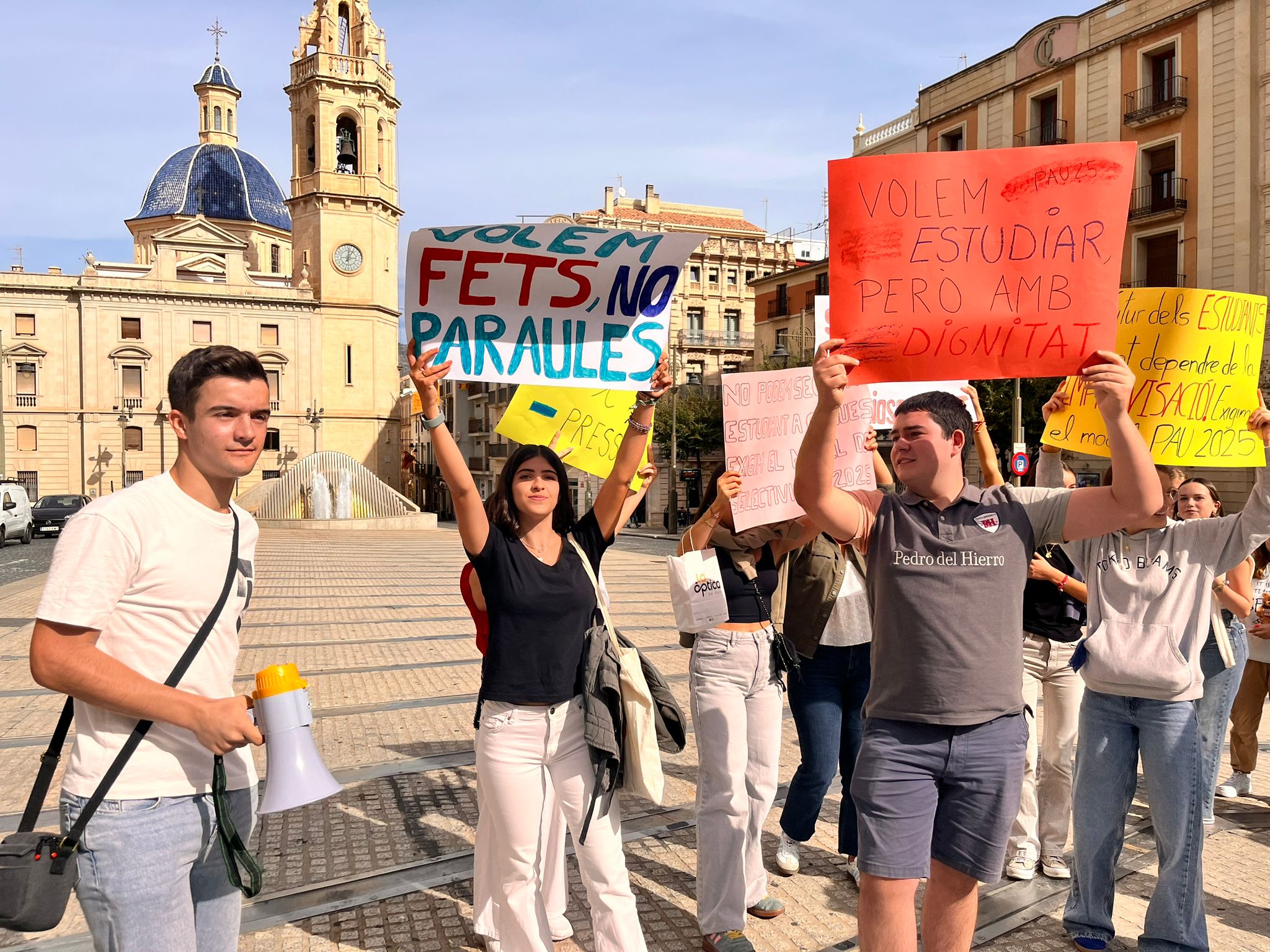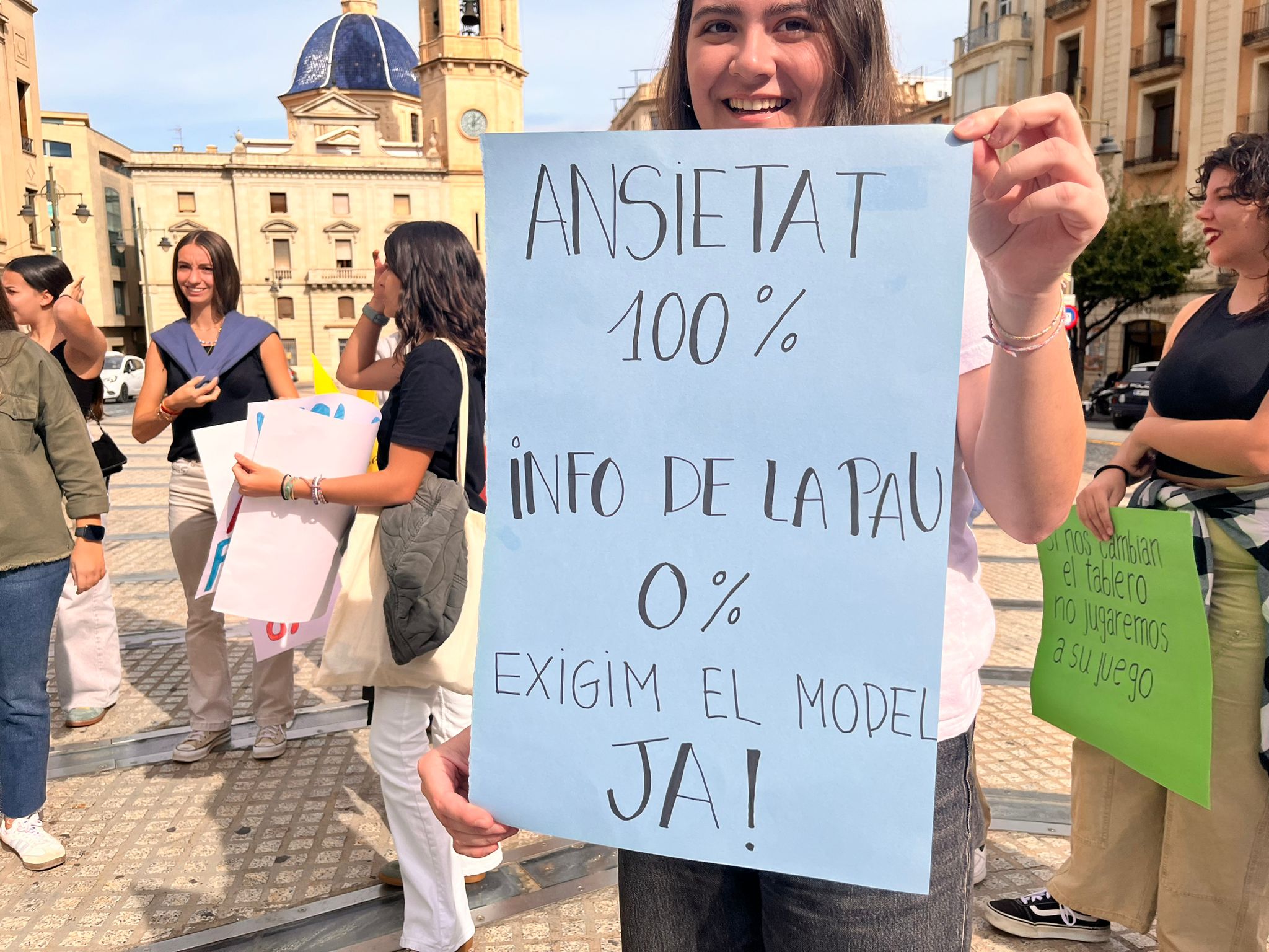 Mig centenar de persones s'ha reunit aquest matí a la Plaça d'Espanyaper demanar que se'ls informe sobre com seran les pròximes proves de l'EBAU per a que tant el professorat com ells com a alumnat puguen preparar-se de manera correcta.