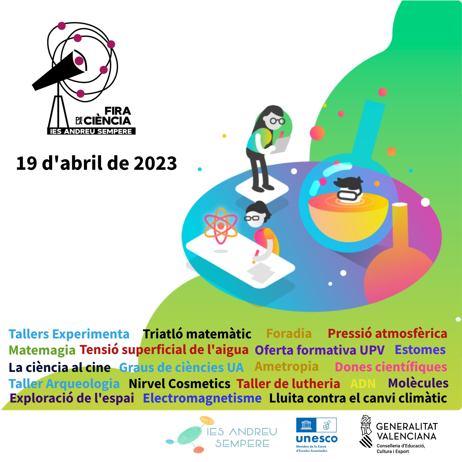 L'IES Andreu Sempere ha preparat la seua primera Fira de ciències amb nombroses activitats per al matí del 19 d'abril. Els alumnes, des de primer d'ESO a primer de Batxillerat, podran participar en diferents tallers sobre pressió atmosfèrica, estomes, ADN, molècules, dones científiques, electromagnetisme o triatló matemàtic. Uns tallers presentats pels alumnes del centre.