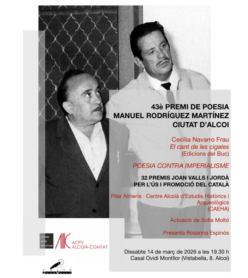 El lliurament té lloc hui, dissabte 14 de març, al Centre Ovidi Montllor a les 19:30, on també es presentarà l’obra guanyadora de la 43a edició del Premi de Poesia Manuel Rodríguez Martínez Ciutat d’Alcoi, El cant de les cigales, de la mallorquina Cecília Navarro, editada per Edicions del Buc. La gala també inclou la interpretació de la cantant alcoiana Sofia Moltó i estarà conduïda per l’actriu Rosanna Espinós.