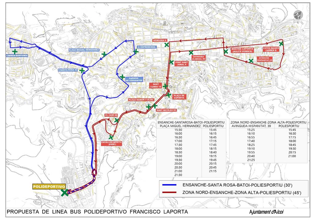El servei té dues línies diferenciades. La primera recorre Santa Rosa, Batoi i una part de l'Eixample, amb una freqüència de 30 minuts, l'eixida és a les 15.30 hores des de la plaça Miguel Hernández, d'allí puja a Batoi on hi ha una parada al carrer Banyeres, 2, la següent parada és en Santa Rosa, 52, (just abans del pont Fernando Reig) i arriba al Poliesportiu a les 15.45 hores. L'autobús segueix amb el recorregut parant en el passeig Cervantes i Espronceda, 2, abans de tornar a la plaça Miguel Hernandez. L'últim autobús ix del Poliesportiu a les 21.15 hores. Aquesta línia ha tingut un total de 356 usos; 104 el dia 1 i 2 i 148 el 3.