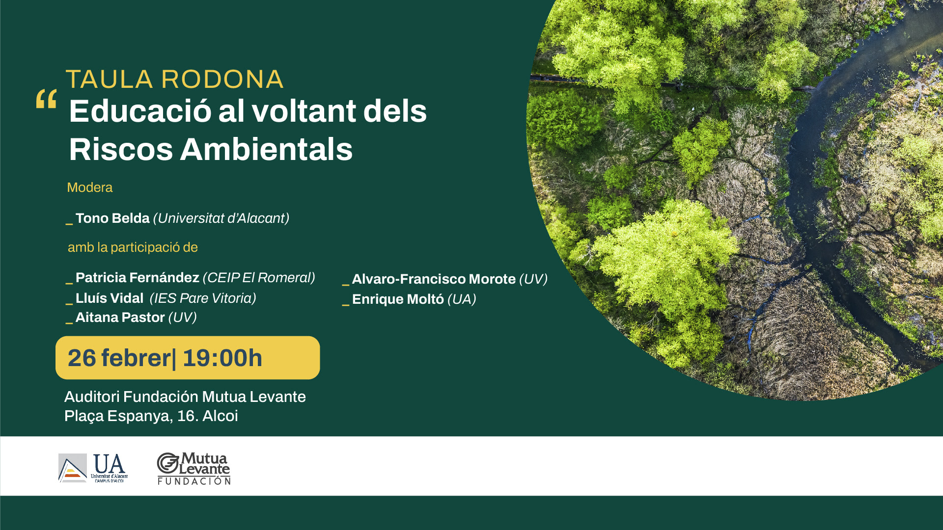 La Universitat d’Alacant, UA, ha organitzat una taula sota el títol ‘Educació al voltant dels Riscos Ambientals’. L’esdeveniment té format de debat i participen Patricia Fernández (CEIP El Romeral), Lluís Vidal (IES Pare Vitoria), Aitana Pastor (Universitat de València), Alvaro-Francisco Morote (Universitat de València) i Enrique Moltó (UA).