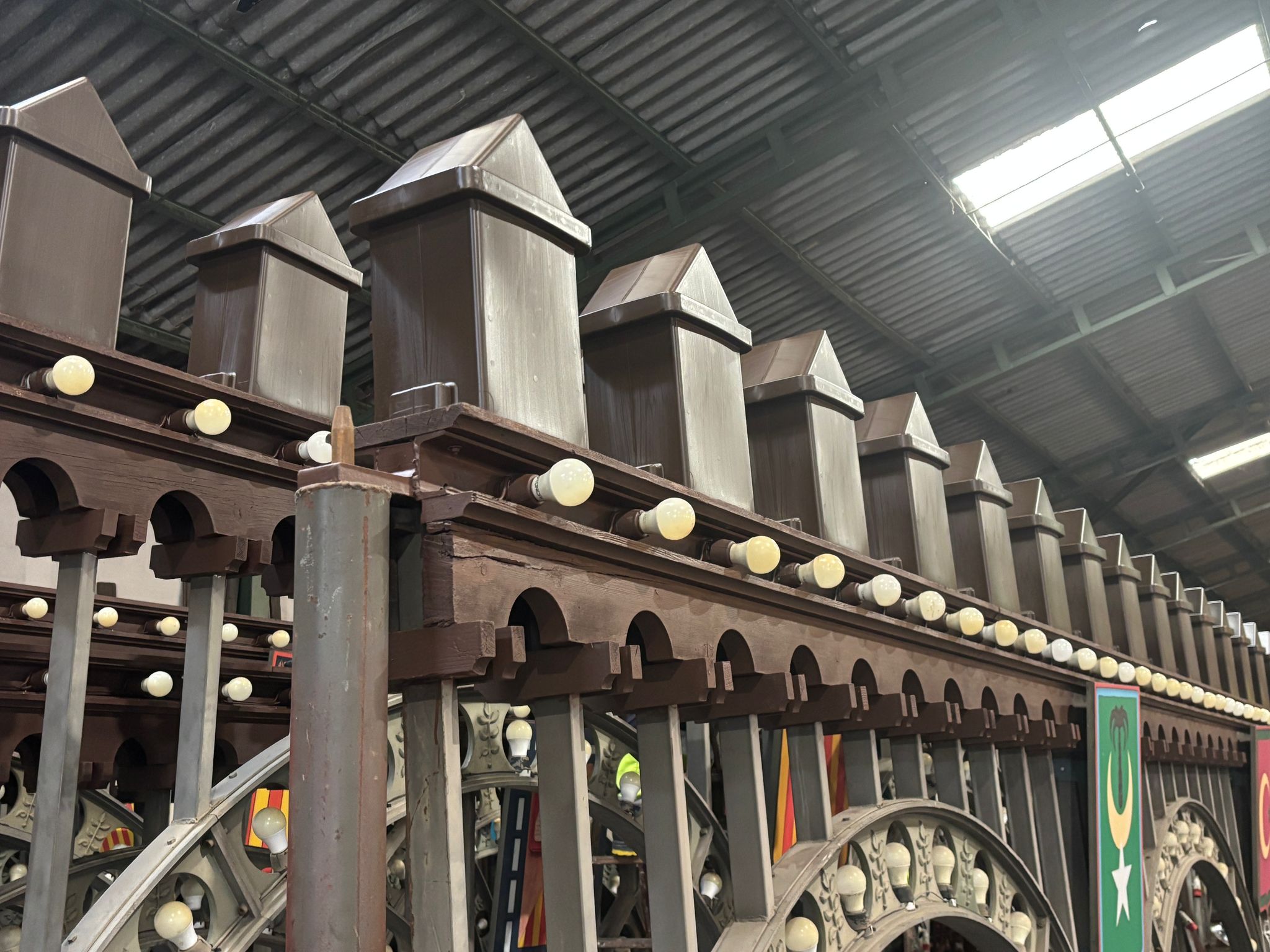 Doncs bé, l’Ajuntament ha decidit substituir els 359 merlets de fusta de la Plaça d’Espanya (la resta són metàl·lics i s’han mantingut) per altres de polietilé, un material molt més lleuger. Gràcies a aquest canvi, l’enramada haurà de suportar quasi 3.000 quilos menys i cada merlet passarà de 10 a 1,8 quilos.
