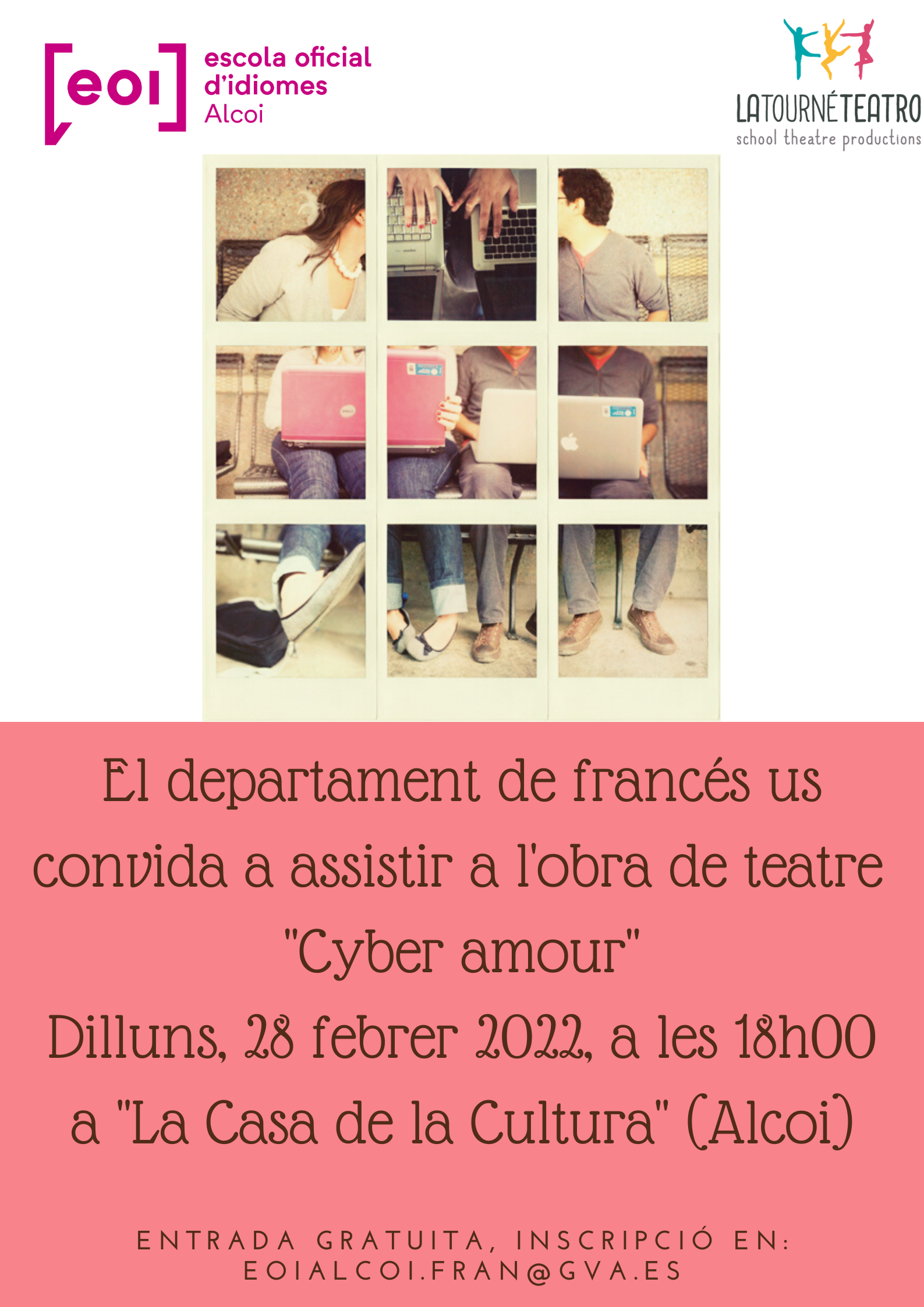 El departament de francés de l'Escola Oficial d'Idiomes ha organitzat una sessió de teatre en francés, gratuït per a tots els interessats. L'obra que s'oferirà és 'Cyber amour', de la companyia La Tourné Teatro. Serà el pròxim dilluns 28 de febrer a les 18 hores, a la casa de la Cultura d'Alcoi.