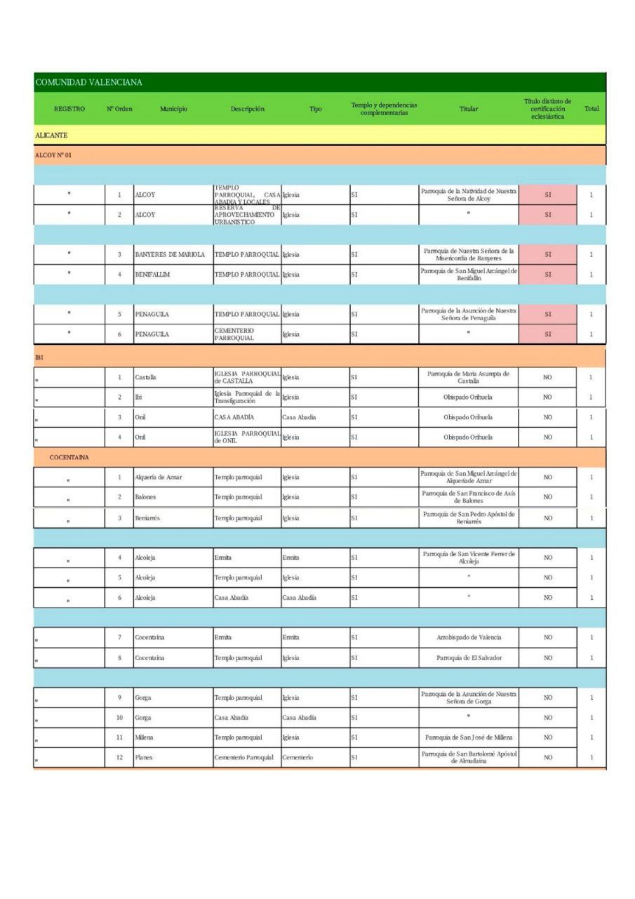 Els municipis on hi ha algun bé immatriculat de l'Església són 15: Alcoi, Banyeres de Mariola, Benifallim, Penàguila, Castalla, Ibi, Onil, l'Alqueria d'Asnar, Balones, Beniarrés, Alcoleja, Cocentaina, Gorga, Millena i Planes.