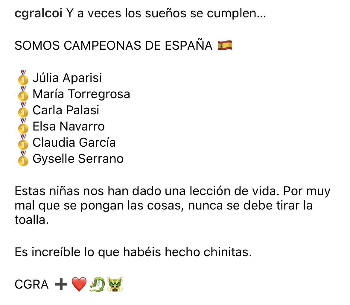 - El conjunt format per les gimnastes Júlia Aparis, María Torregrosa, Carla Palasi, Elsa Navarro, Claudia García i Gyselle Serrano es proclama Campió d'Espanya.