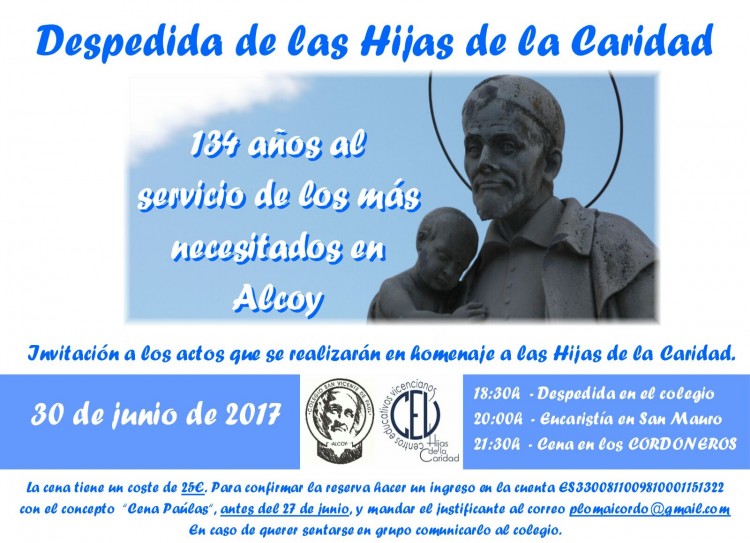 I per acomiadar com cal a les monges, des d'Alcoi es prepara un homenatge pels 134 anys de presència i servici en la ciutat, primer al col·legi de Sant Mateu i després a l'actual de Santa Rosa. Serà aquest divendres 30 de juny, primer amb un acte al col·legi, després amb una missa a Sant Maure, i finalment amb un sopar de germanor obert a tot el que vulga, a la Filà Cordoneros.