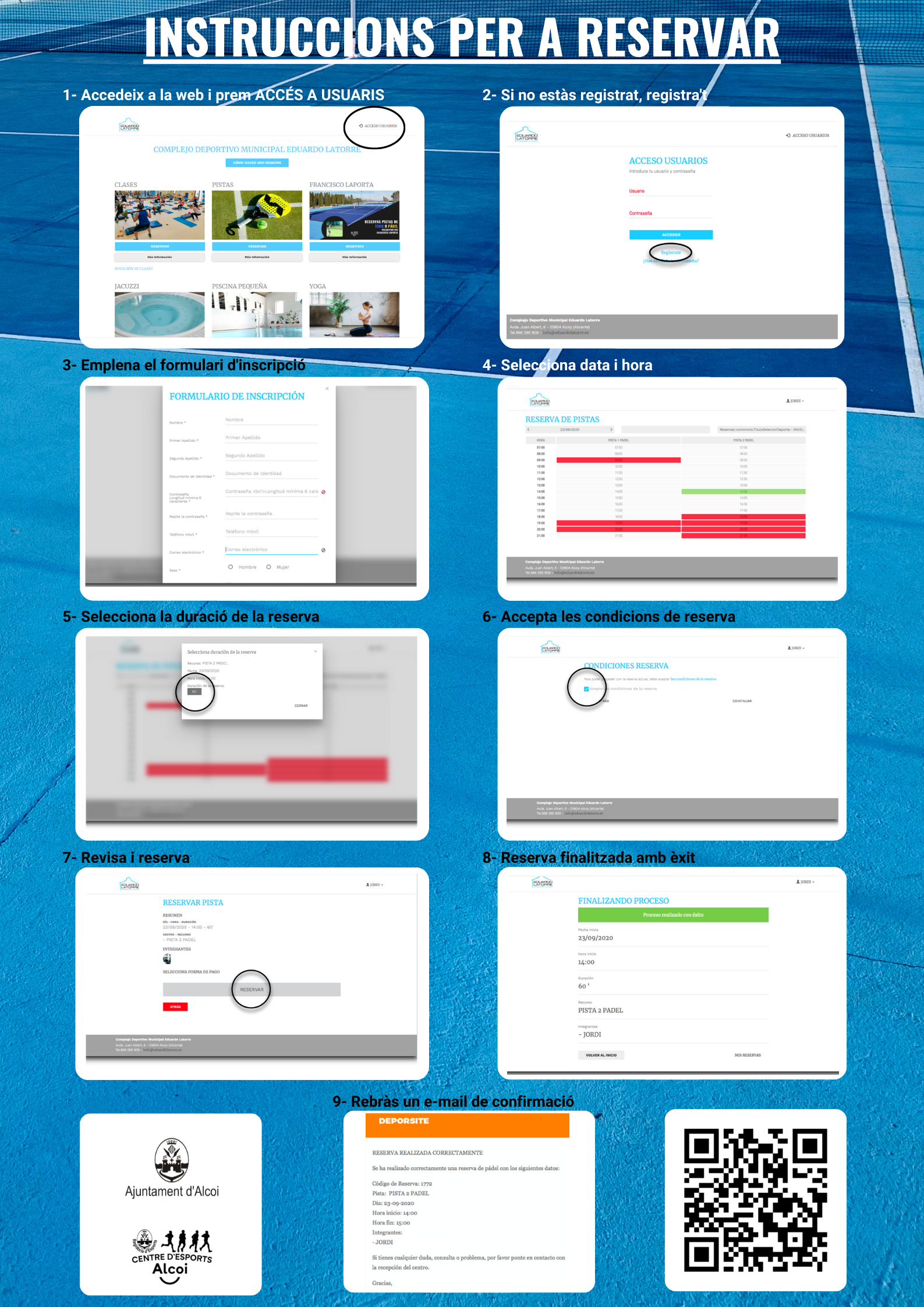 Es podrà fer la reserva amb antelació d'1 dia en els horaris disponibles i sempre en hores en punt i per un període de temps de 60 o 120 minuts. Una vegada realitzada la reserva, arribarà un email de confirmació a la persona que realitza la reserva (només és necessari que reserva un dels jugadors). Aquest email serà el que s'haurà d'ensenyar a l'operari del poliesportiu perquè comprove que és vàlida la reserva. També es pot mostrar el mòbil amb l'aplicació i la reserva confirmada.