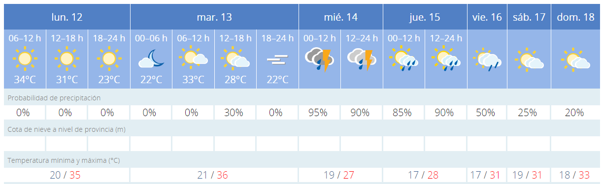 Aquest dilluns i dimarts, 12 i 13 d’agost, les temperatures segueixen sent les pròpies de l’estiu, amb mínimes que ronden els 20 graus i màximes que ronden els 36 (si ens fixem en les previsions per a Alcoi). La noticia aquesta setmana és la inestabilitat que s’espera de cara a dimecres i dijous, just al festiu del mes d’agost.