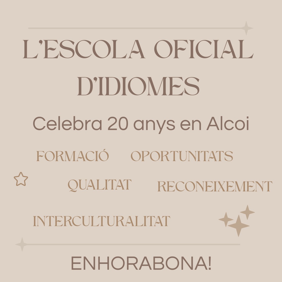 L’Escola Oficial d’Idiomes, EOI, va aterrar a Alcoi el curs 2004-2005 amb tres idiomes: anglés, alemany i francès; però ho va fer amb un aulari que depenia de l’EOI d’Alacant. Quan per fi va aconseguir la seua independència, l’EOI Alcoi es va convertir en una de les 25 seus que hi ha a tota la Comunitat Valenciana. I enguany compleix 20 anys des que va arrancar la seua tasca formativa i educativa.