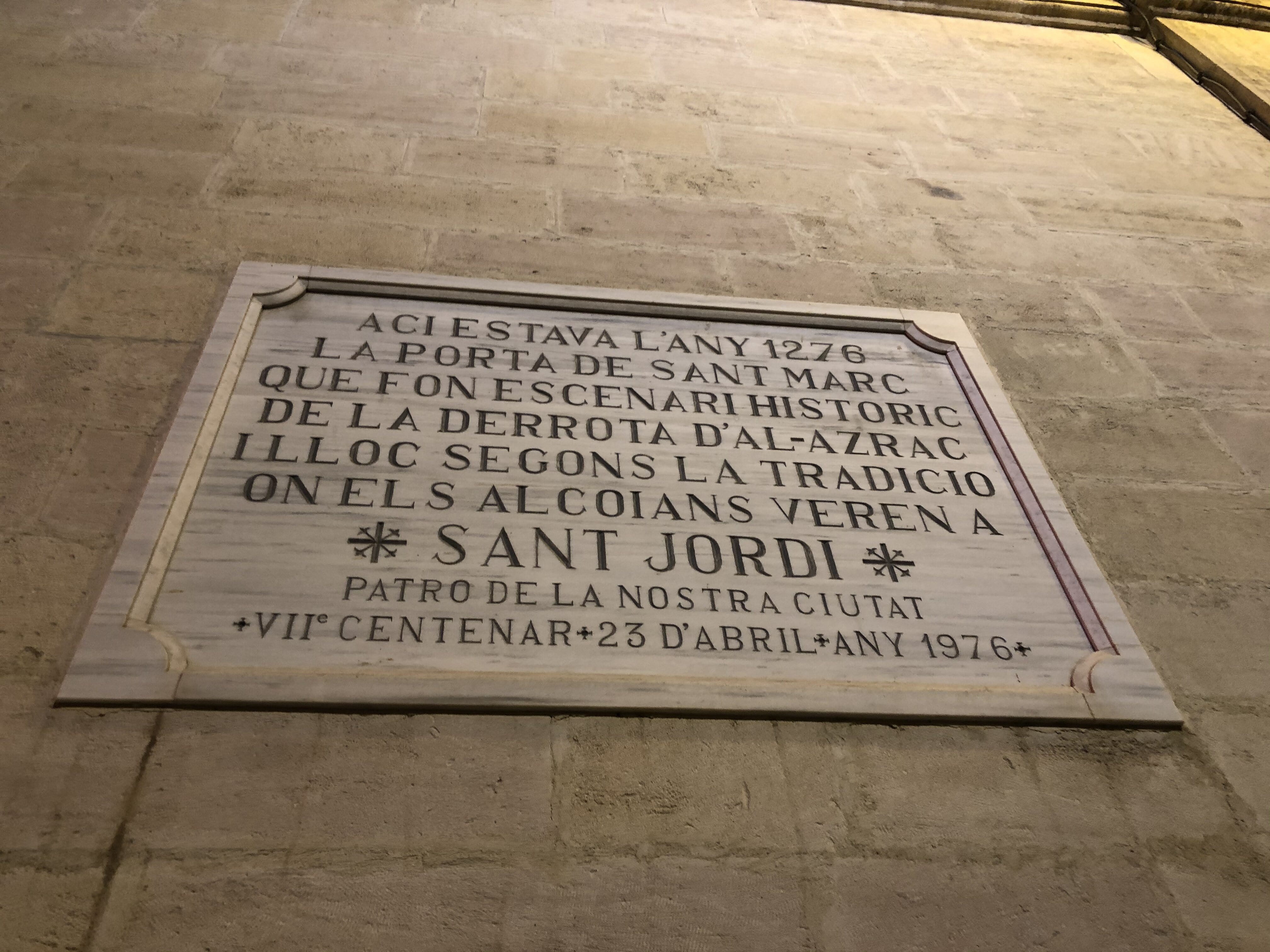 “ACÍ ESTAVA L’ANY 1276 LA PORTA DE SANT MARC QUE FON ESCENARI HISTÒRIC DE LA DERROTA D’AL-AZRAC I LLOC SEGONS LA TRADICIÓ ON ELS ALCOIANS VEREN A SANT JORDI PATRÓ DE LA NOSTRA CIUTAT. VII CENTENARI 23 ABRIL ANY 1976.”