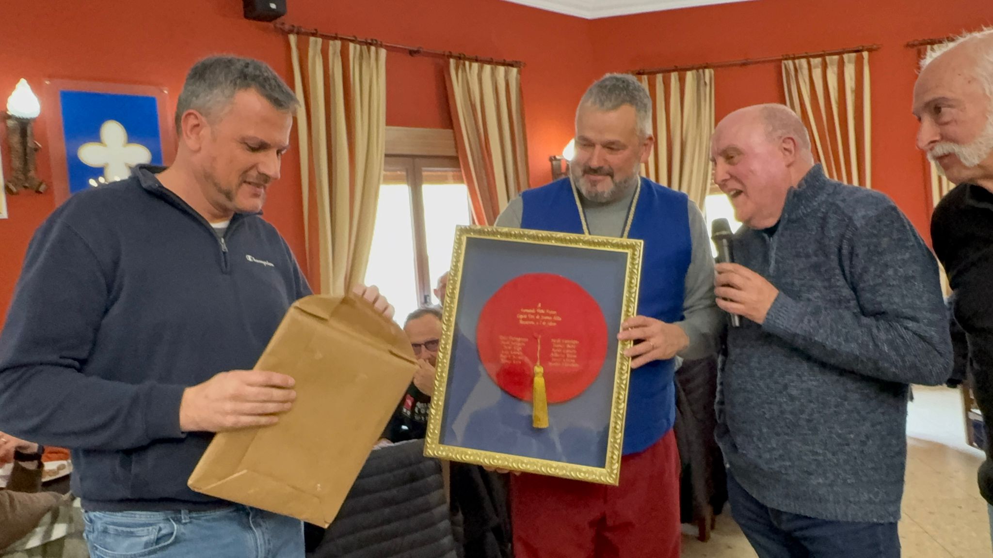 En el dinar previ a la desfilada, els integrants de l’esquadra van fer entrega al capità i al president de la filà d’una boina personalitzada amb el nom de tots els seus membres.