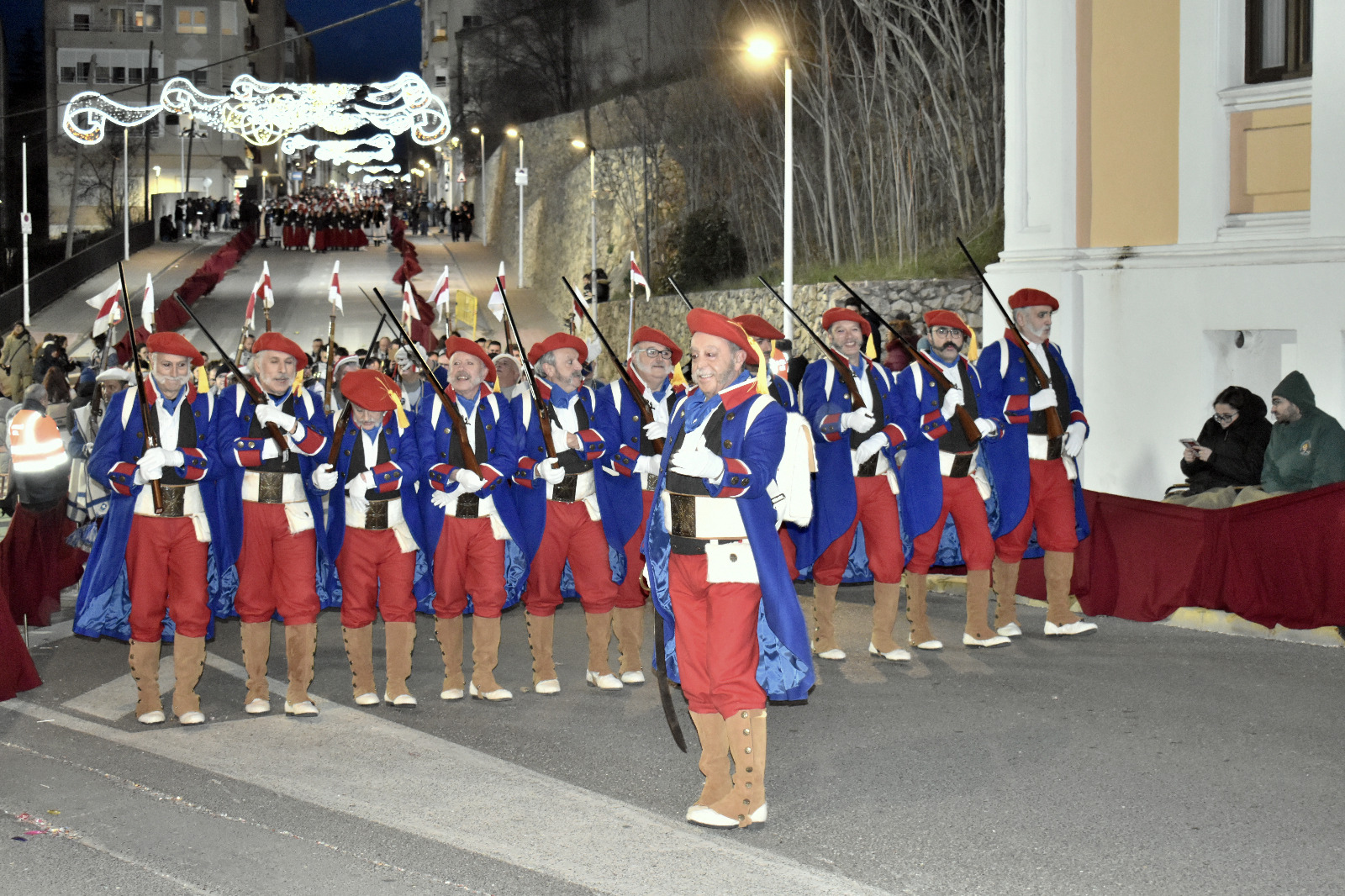 Els integrants de l’esquadra del 150 aniversari de la Filà Navarros d’Alcoi han desfilat en les Entrades de Bocairent, celebrades el passat dissabte 7 de febrer, com a part del boato de la capitania de la Filà Terç de Suavos, del bàndol cristià.