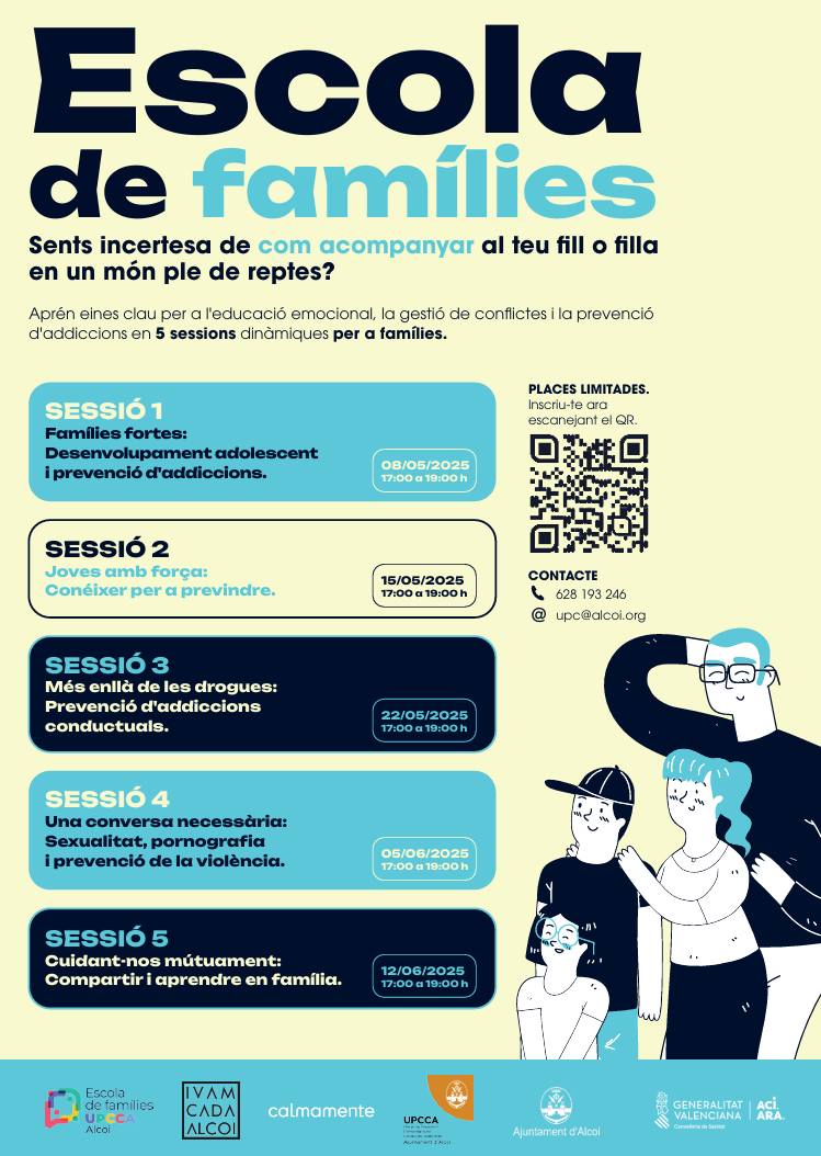 Des de la Unitat de Prevenció Comunitària de Conductes Addictives (UPCCA), que pertany a la Regidoria de Polítiques Inclusive de l’Ajuntament d’Alcoi, llancen una tercera edición de l’Escola de Famílies, i ho fa gràcies a l’èxit en la participación en les dos edicions anteriors.