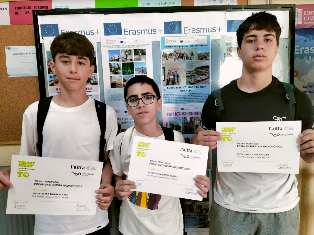 El centre educatiu públic Andreu Sempre es troba d’enhorabona, doncs el seu alumnat ha aconseguit diversos premis en les darreres setmanes en projectes de diversa naturalesa. Dos dels quatre s’han obtés al Festival Tiran Avant Europeu 2024, aquests guardons reconeixen la tasca de producció audiovisual realitzada per centres educatius de tot tipus de domini lingüístic. Aquesta és la tercera edició del festival que està organitzat per APROCAT (Associació per a la Promoció del Català) amb el suport del Departament de Cultura de la Genealitat de Catalunya i la col·laboració de l'Agència d'Informació, Formació i Foment de l'Audiovisual, la Diputació de València i la Vicepresidència Primera i Conselleria de Cultura i Esport de la Generalitat Valenciana.