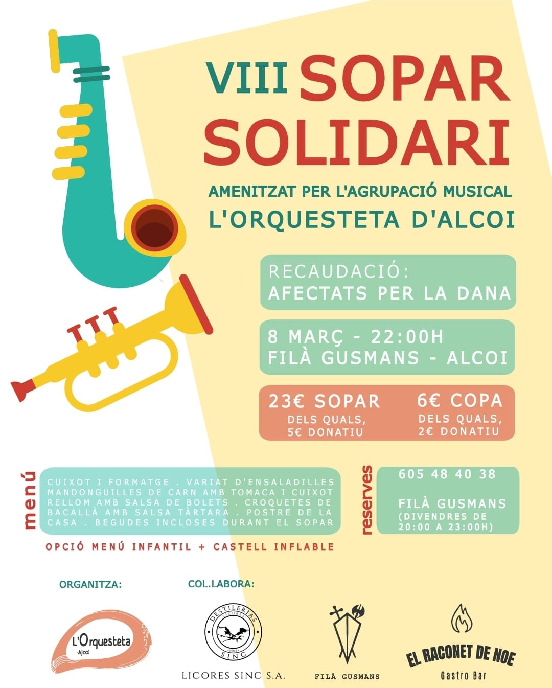 El sopar té lloc a la Filà Gusmans el dissabte 8 de març a les 22:00 hores i ofereix un menú a 23 euros (5 dels quals aniran íntegrament als afectats per la DANA) que inclou cuixot i formatge, diferents ensaladilles, mandonguilles de carn i tomaca i cuixot, rellom amb salsa de bolets, croquetes de bacallà amb salsa tàrtara, postres de la casa, així com les begudes incloses durant el sopar. La resta de copes tindran un cost individual de 6 euros (2 dels quals són per als afectats per la DANA).