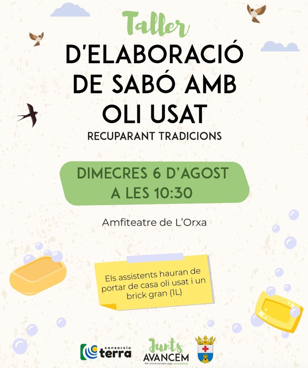 Aquesta setmana, L’Orxa es converteix en un punt de trobada cultural amb propostes per a tots els públics. El dimecres 6 d’agost a les 10:30 h, l’amfiteatre ha acollit un taller d’elaboració de sabó amb oli usat, una activitat organitzada pel Consorci Terra que busca recuperar tradicions sostenibles i fomentar el reciclatge domèstic.