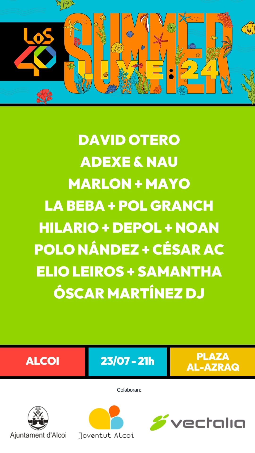 Torna a Alcoi un any més “Los 40 Summer Live”, el dia 23 de juliol a les 23:00 començarà el festival estiuenc, que estarà situat en la plaça d’Al-Azraq. Com a novetat l'entrada serà lliure, el que és un incentiu més per a disfrutar de l’esdeveniment.