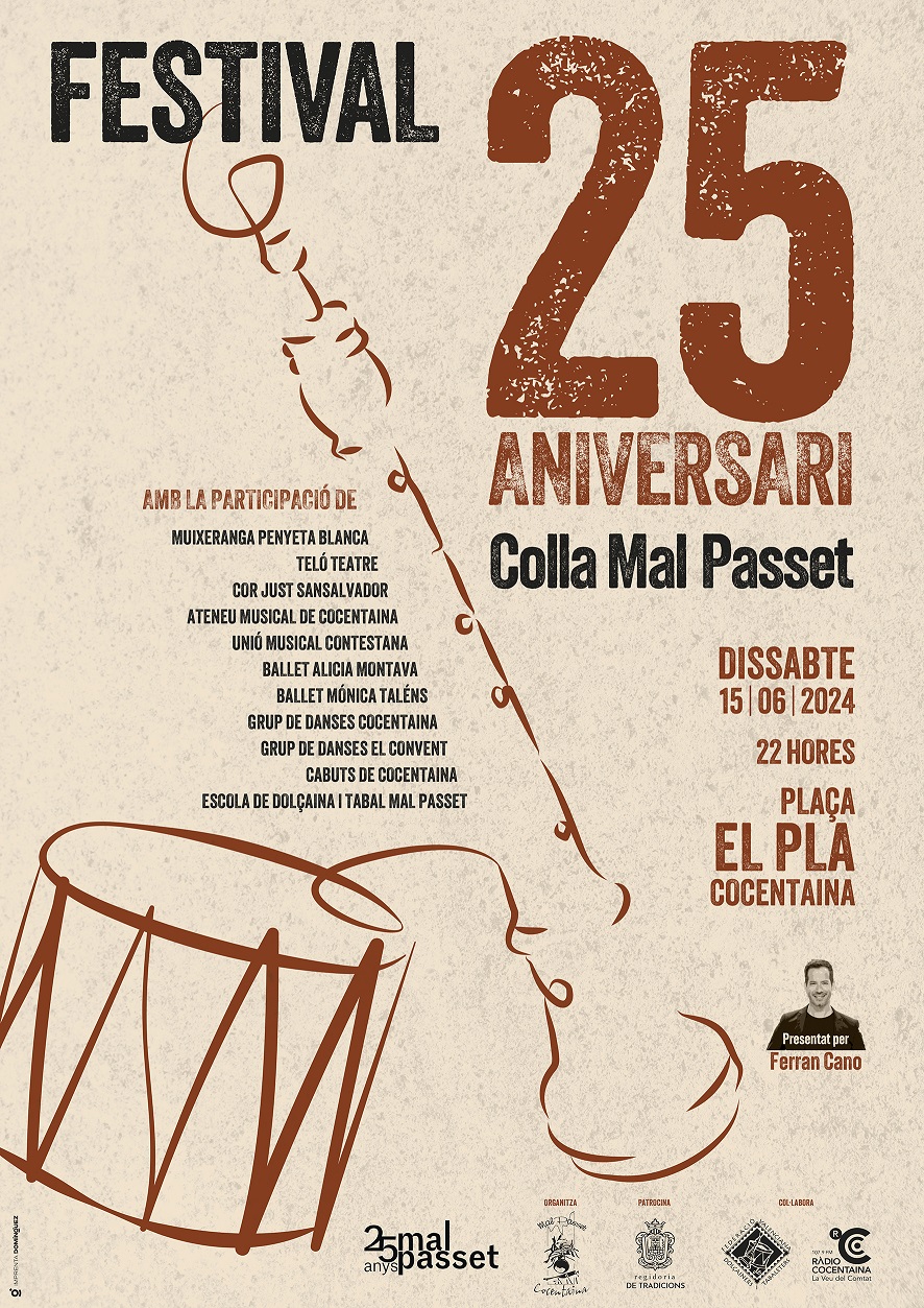 25 anys d’història compleix la Colla de Dolçaines i Tabals Mal Passet de Cocentaina i per commemorar aquesta data tan especial la colla ha preparat un esdeveniment en el que participen diverses agrupacions culturals contestanes (Muixeranga Penyeta Blanca, Teló Teatre, Cor Just Sansalvador, Ateneu Musical de Cocentaina, Unió Musical Contestana, Ballet Alicia Montava, Ballet Mónica Taléns, Grup de Danses de Cocentaina, Grup de Danses El Convent, Cabuts de Cocentaina i l'Escola de Dolçaina i Tabal Mal Passet), audiovisuals i tot amb la presentació del periodista Ferran Cano.