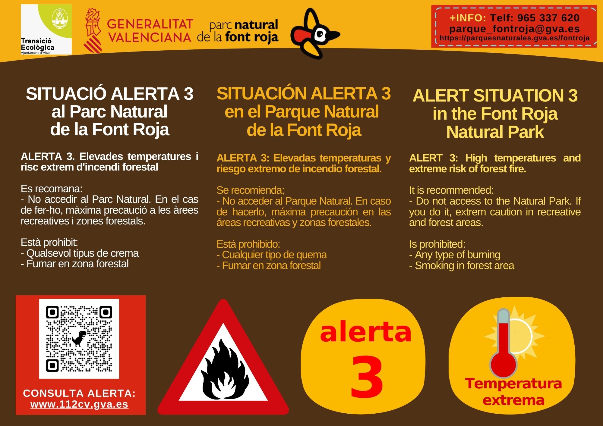Les recomanacions per a esta onada de calor ja les coneixeu; no exposar-se en hores centrals del dia, protegir-se el cap, evitar l'alcohol i els menjars generosos, i beure molta aigua. Al parc natural de la Font Roja s'ha eliminat la restricció d'accés i la tanca torna a estar oberta, però igualment es recomana no accedir al parc.