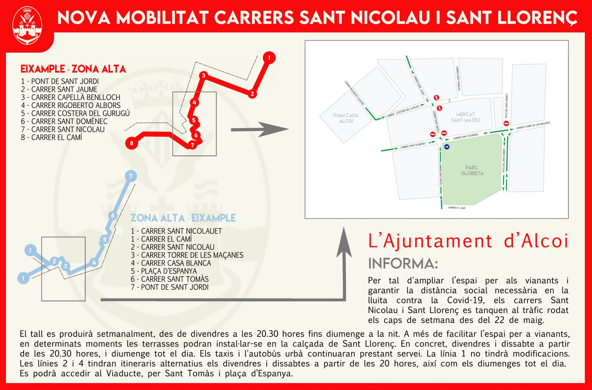 Igual que el cap de setmana passat, a partir d’aquest divendres 29 de maig a les 20.30 h, no es podrà circular amb vehicle pels carrers Sant Llorenç i Sant Nicolau fins diumenge a la nit. La novetat estarà en l’accés cap al Viaducte, al qual es podrà anar pel carrer Sant Tomàs i per la plaça d’Espanya.